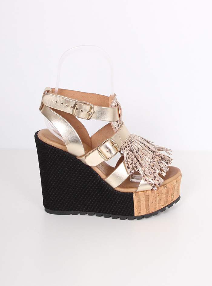 Δερμάτινη πλατφόρμα σε χρυσό-μαύρο με κρόσια στα λουράκια, άνετο ανατομικό πάτο με ύφασμα πλέξης και φελλό στην πλατφόρμα.