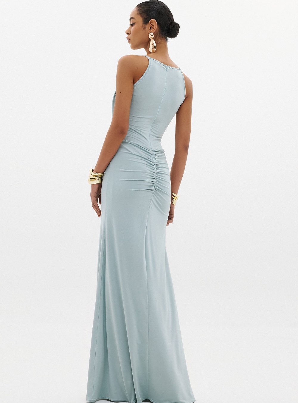 Μακρύ ελαστικό φόρεμα που αγκαλιάζει τη σιλουέτα, με άνοιγμα στο κέντρο σε sage(φασκόμηλο) χρώμα ANNA SAMOUKA NAOMI DRESS.