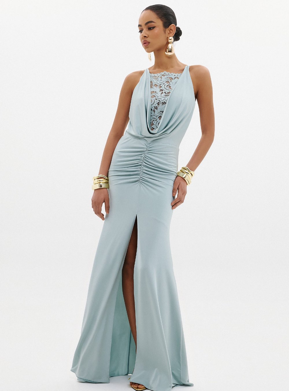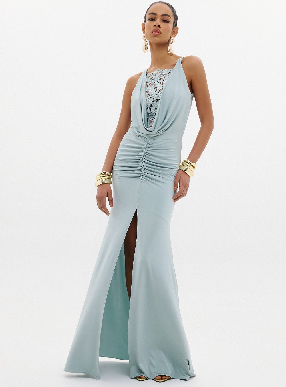 Μακρύ ελαστικό φόρεμα που αγκαλιάζει τη σιλουέτα, με άνοιγμα στο κέντρο σε sage(φασκόμηλο) χρώμα ANNA SAMOUKA NAOMI DRESS. Διαθέτει δαντέλα στο ντεκολτέ και πέφτει ντραπέ. Κλείνει με φερμουάρ στο πίσω μέρος. Κατασκευάζεται εξ ολοκλήρου στην Ελλάδα