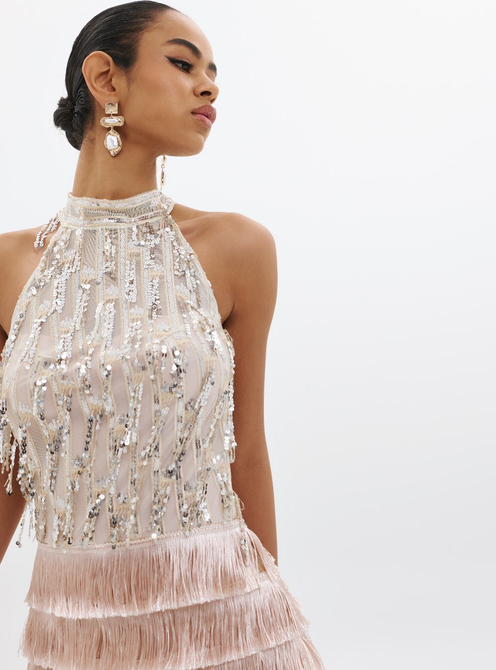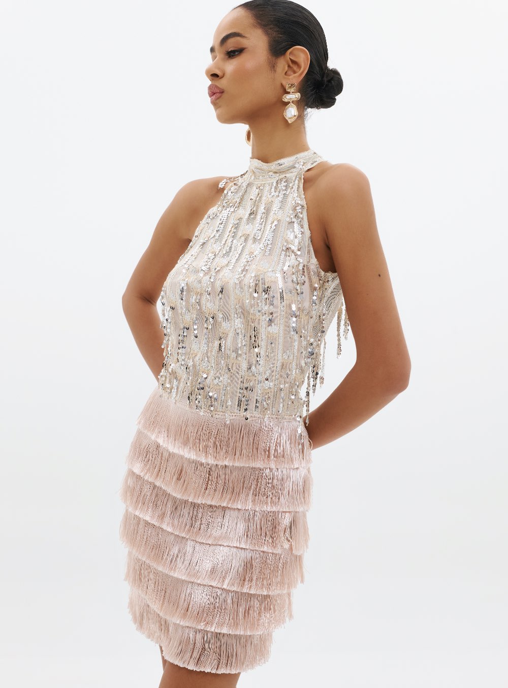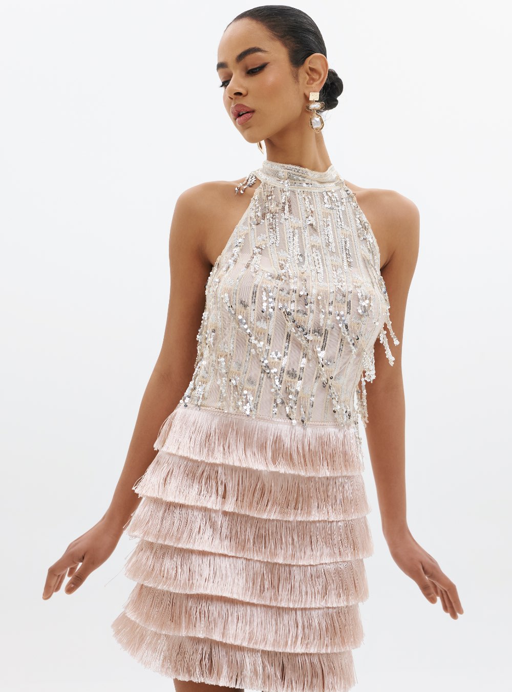 Μίνι φόρεμα που δένει στο λαιμό με παγιέτες στο πάνω μέρος και κρόσια στο κάτω μέρος κατασκευασμένο από υψηλής ποιότητας υφάσματα.