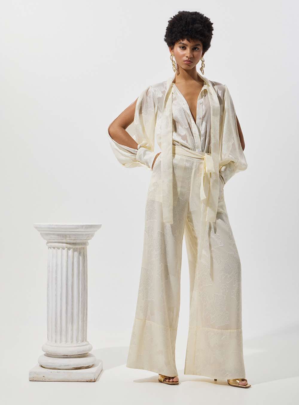 Ψηλόμεση devore ημιδιάφανη παντελόνα με λάστιχο στη μέση και ζώνη στο ίδιο ύφασμα. Διαθέτει κρυφό φερμουάρ και τσέπες στο πλάι.