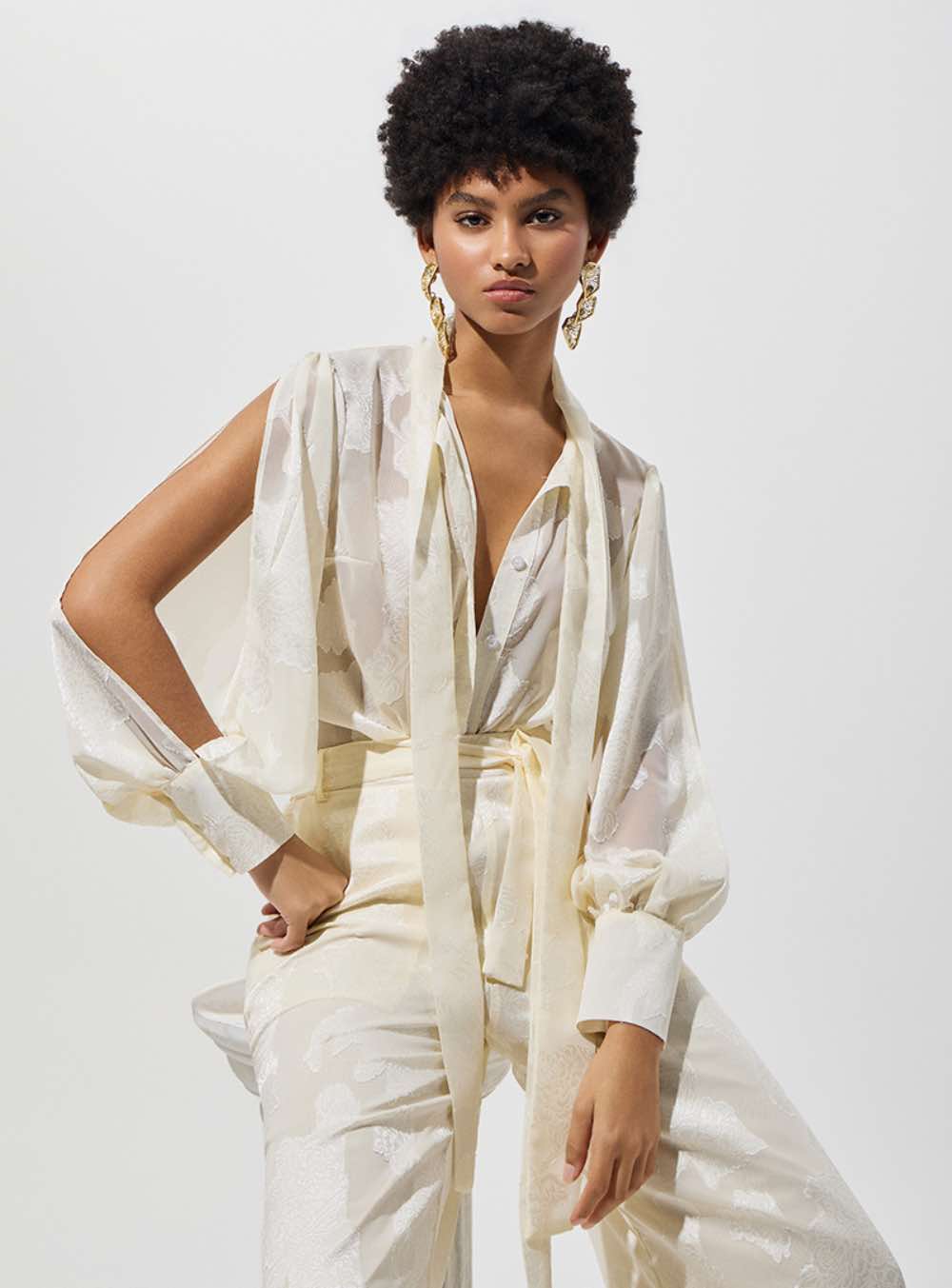 Oversized ημιδιάφανο πουκάμισο με και μανίκια με άνοιγμα. Διαθέτει ίσια γραμμή , κλείσιμο με κουμπιά εμπρός και δένει με κορδέλα στο λαιμό.