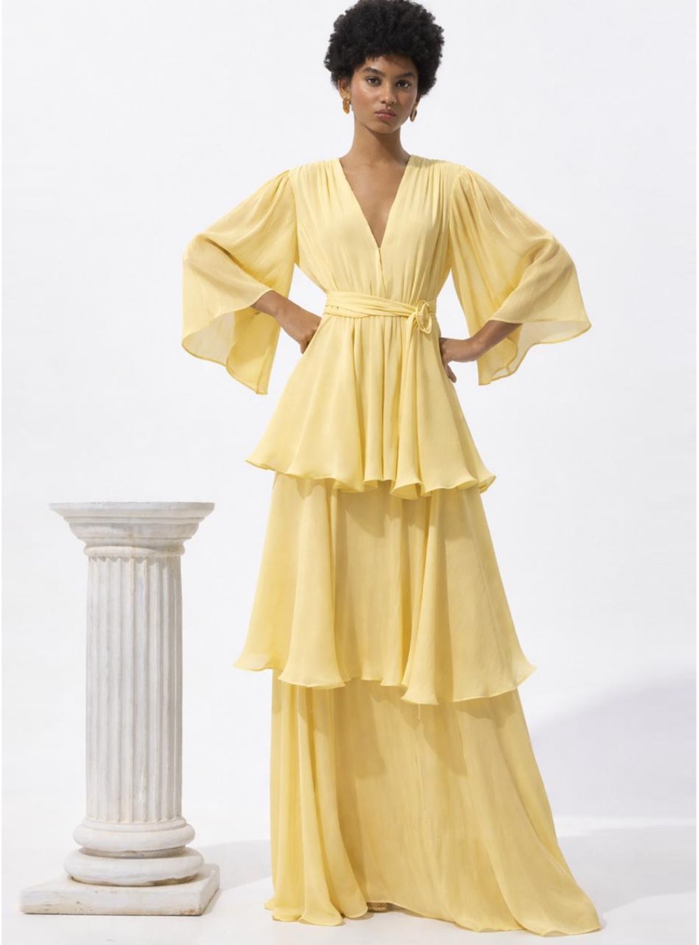 Το φόρεμα με πολλές στρώσεις βολάν, βαθύ ντεκολτέ, μέση με λάστιχο και ζώνη, 3/4 μανίκια καμπάνα, θα αναδείξει την θηλυκότητά σου με μοναδικό τρόπο.