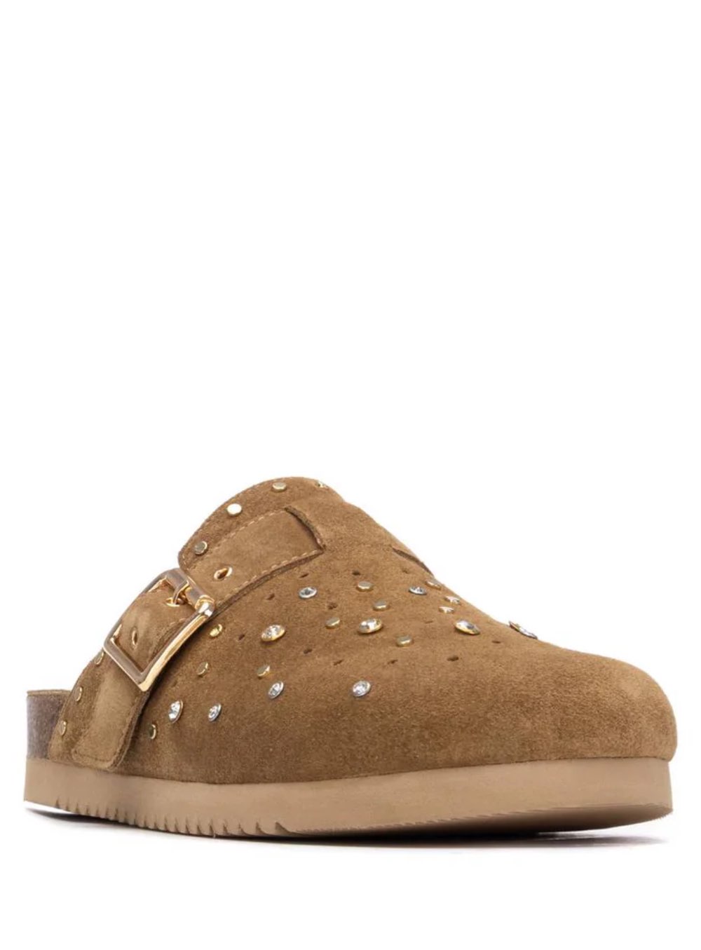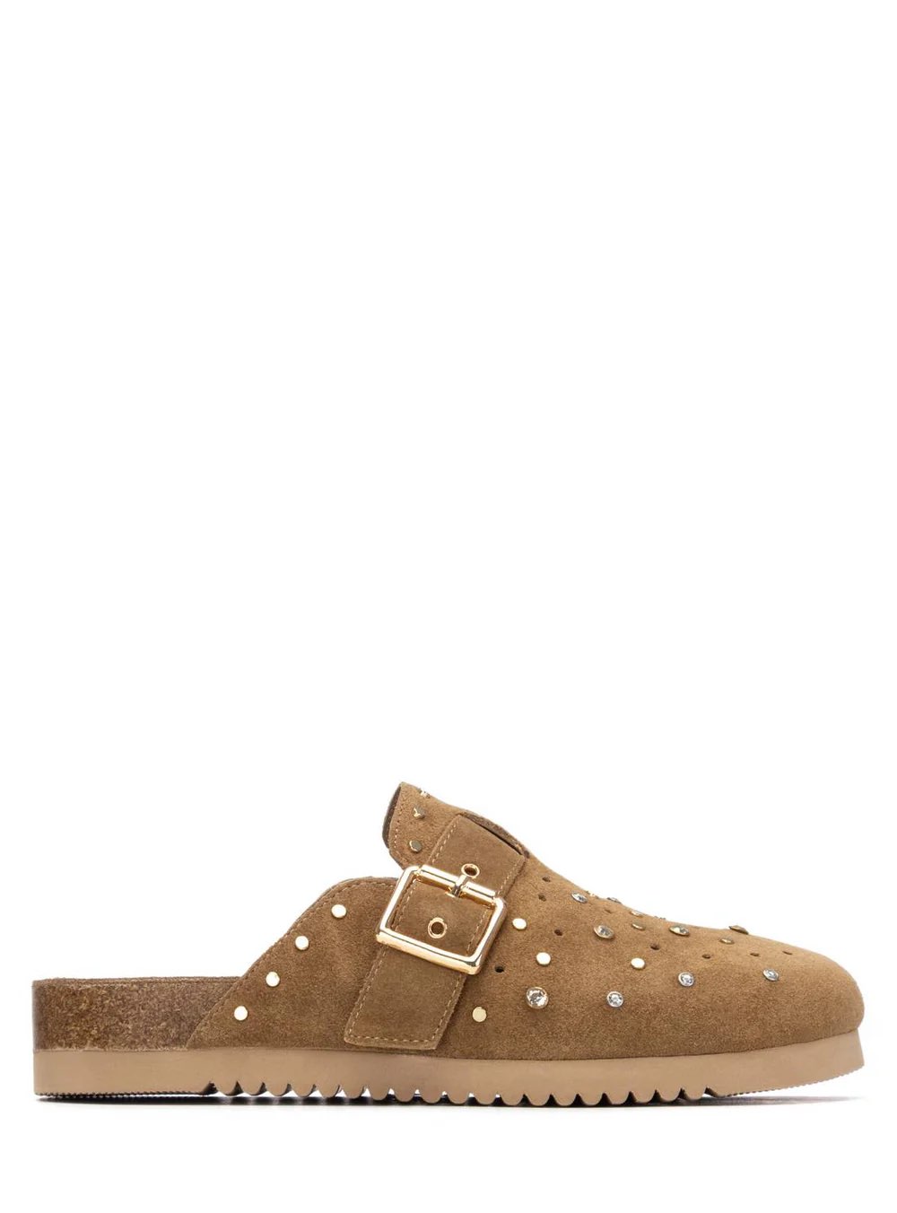 Γυναικεία δερμάτινα σαμπό (Clogs) κατασκευασμένα από υψηλής ποιότητας suede δέρμα με διακοσμητικά τρουκς μπροστά και στο πλάι σε κάμελ χρώμα
