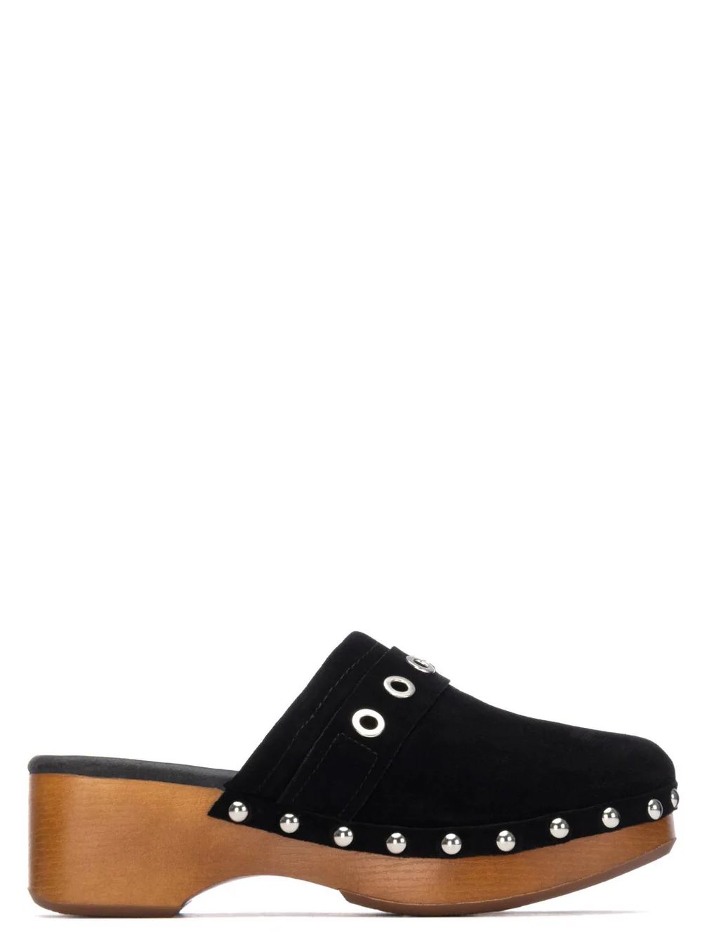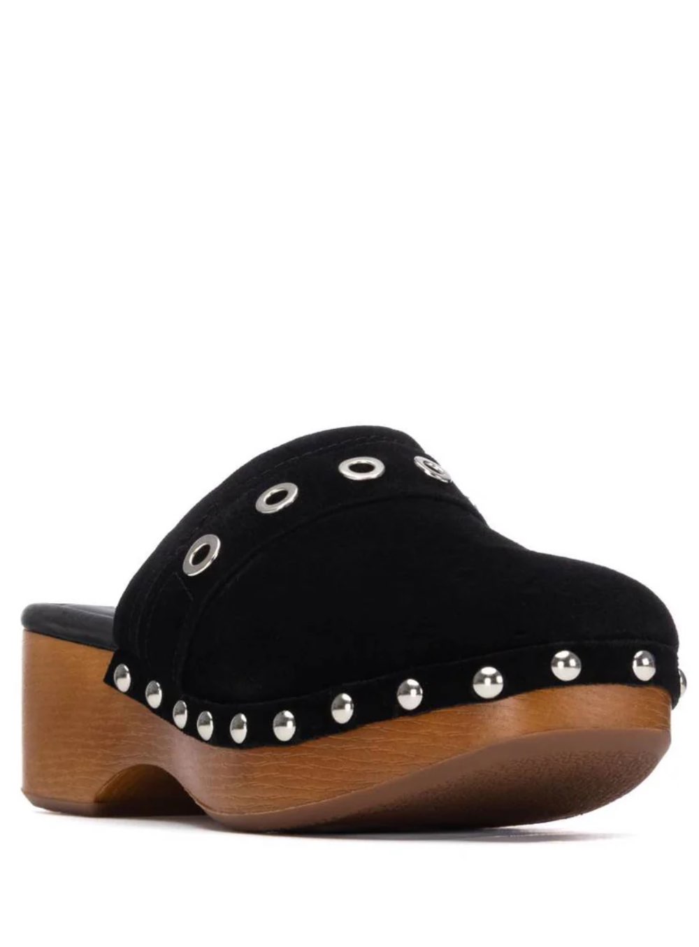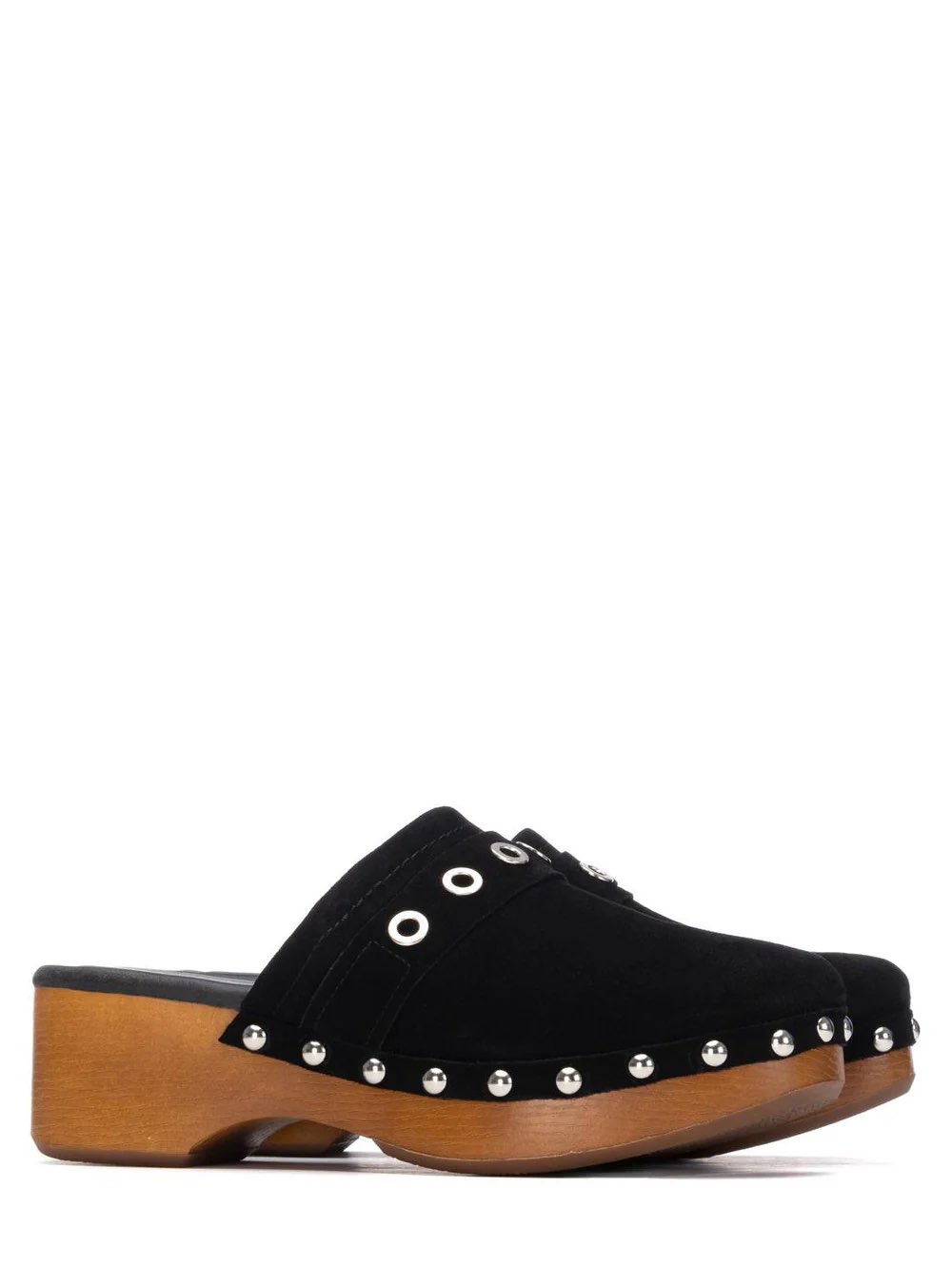 Γυναικεία δερμάτινα σαμπό (Clogs) κατασκευασμένα από υψηλής ποιότητας suede δέρμα με διακοσμητικά τρουκς στο πλάι και τακούνι ύψους 6 εκ. με πλατφόρμα για ακόμα μεγαλύτερη άνεση στο περπάτημα.