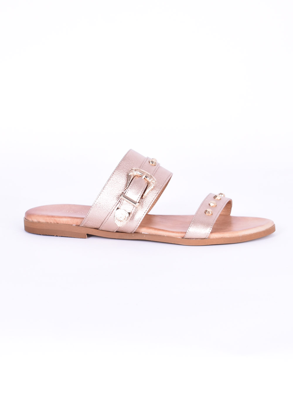 Γυναικεία δερμάτινα σανδάλια φλατ με με χρυσές λεπτομέρειες στο χρώμα του χαλκού.