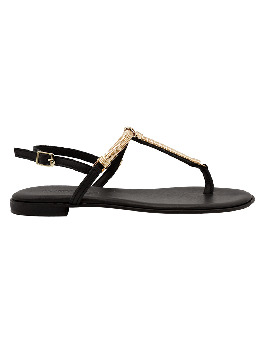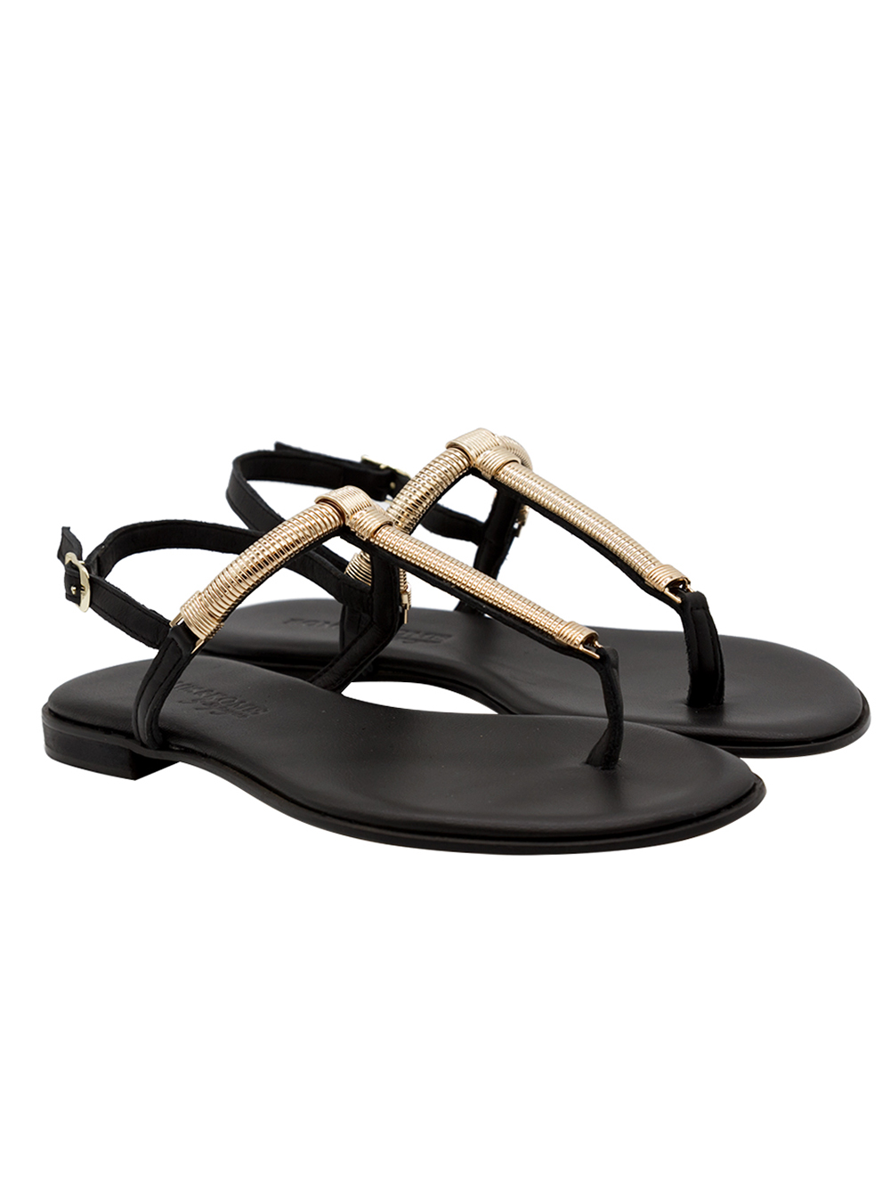 Γυναικεία σανδάλια χειροποίητα κατασκευασμένα από δέρμα υψηλής ποιότητας με μεταλλική λεπτομέρεια σε μαύρο χρώμα.