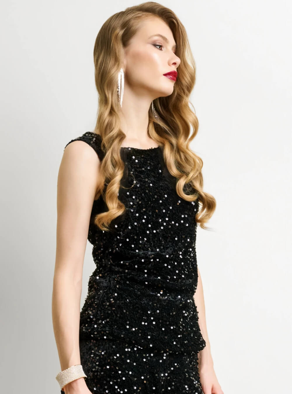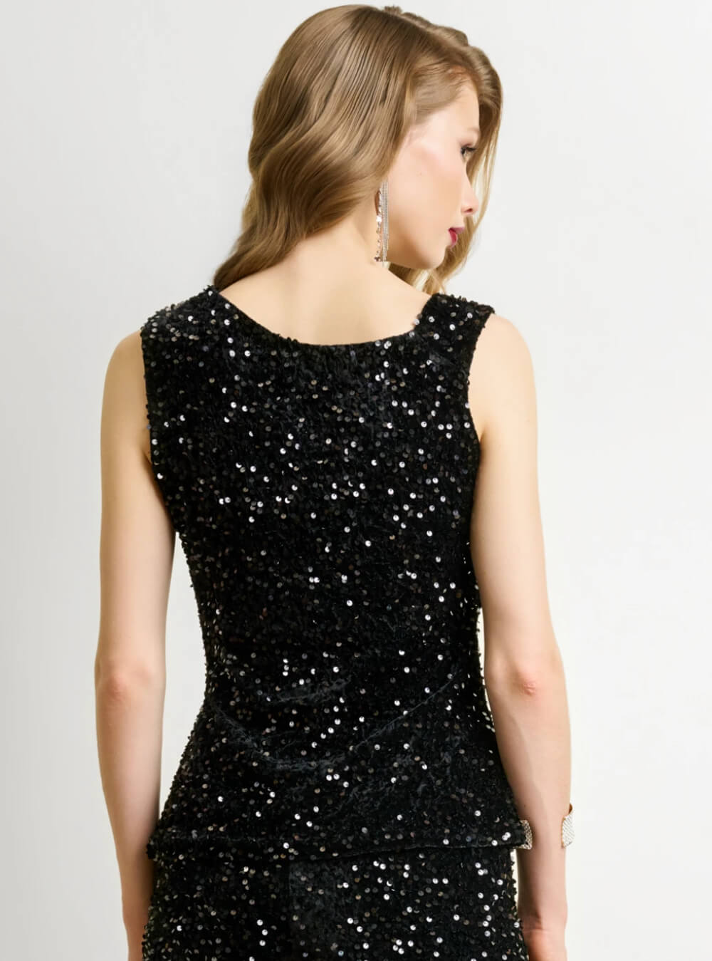 Μαύρη μπλούζα με σούρες διακοσμημένη με λαμπερές παγιέτες. Η sleeveless σχεδίαση και η στενή γραμμή δημιουργούν ένα κομψό και θηλυκό αποτέλεσμα, ιδανικό για εμφανίσεις που θέλουν λάμψη και στυλ. Οι παγιέτες προσδίδουν πολυτέλεια και κάνουν το κομμάτι αυτό να ξεχωρίζει σε κάθε περίσταση. Διαθέτει φόδρα εσωτερικά. Συνδυάζεται άψογα με την ιδια φούστα και το ίδιο παντελόνι για βραδινές εξόδους, parties ή επίσημα events.