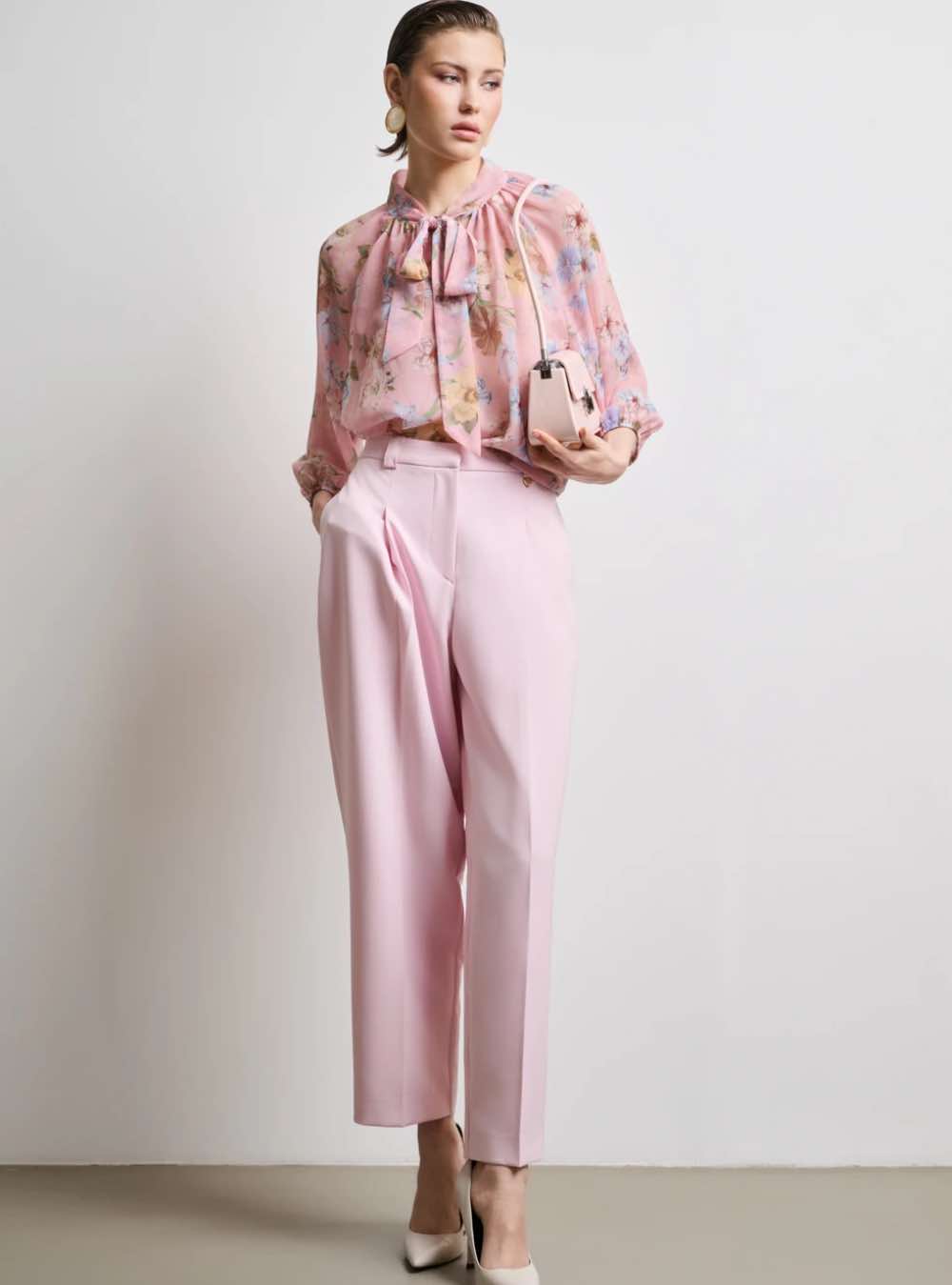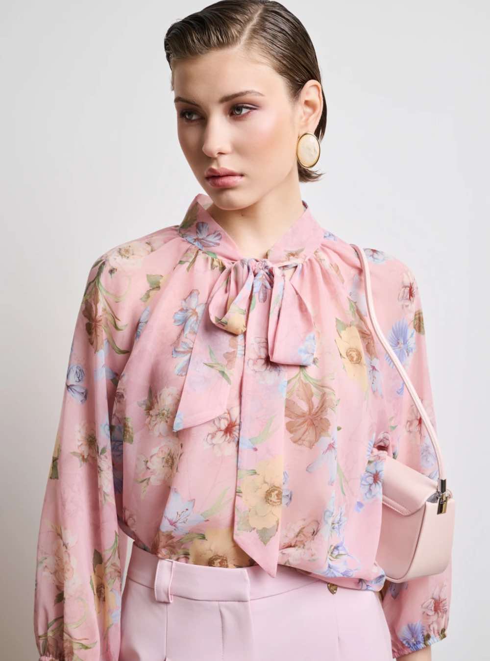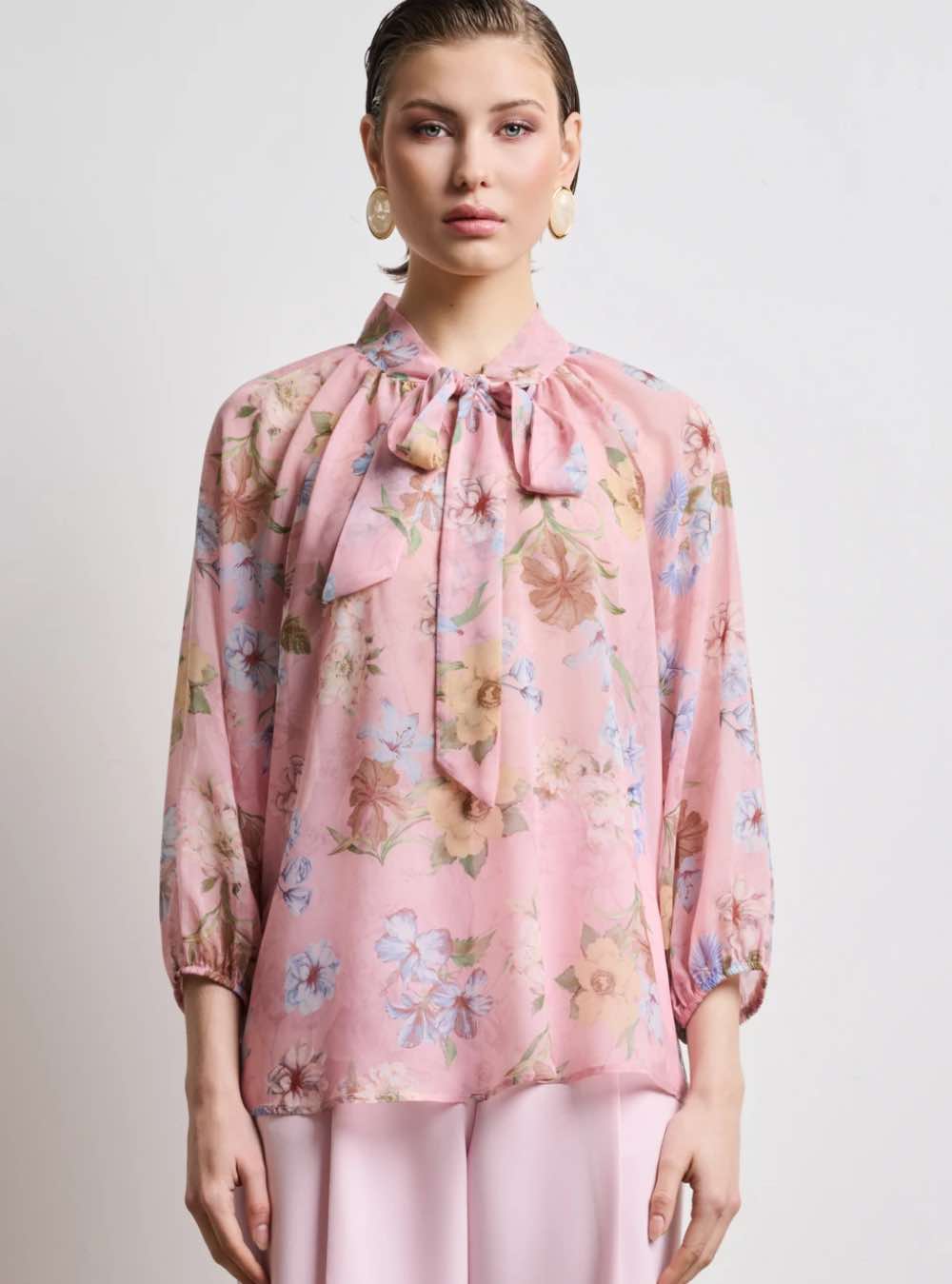 Ροζ εμπριμέ μπλούζα από ελαφριά μουσελίνα.