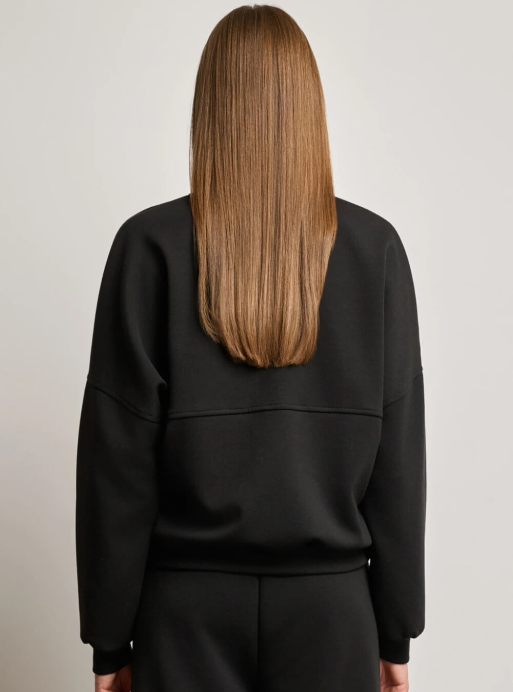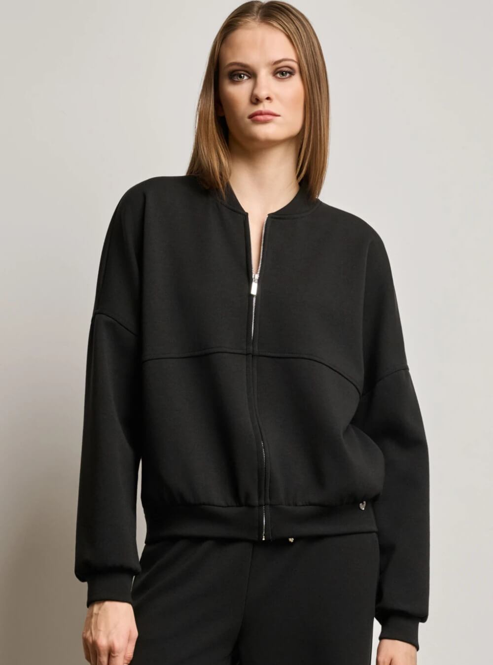 Φούτερ με μεταλλικό φερμουάρ, μακριά μανίκια με ριμπ μανσέτες, ελαφρώς bomber κόψιμο και χαλαρή εφαρμογή.