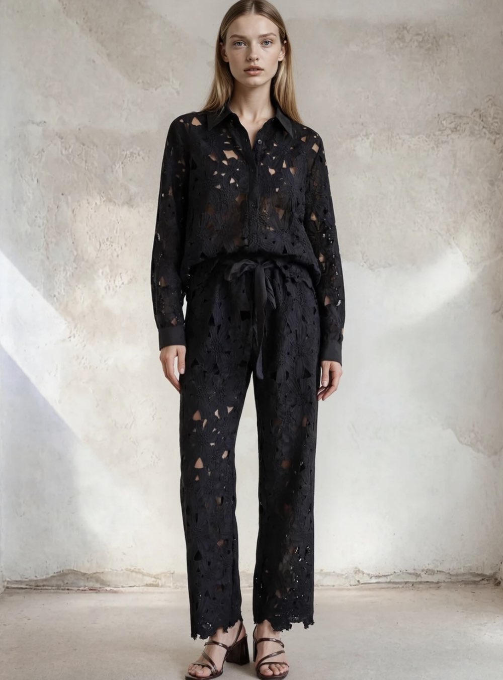 Γυναικείο κεντημένο σετ που αποτελείται από μαύρο πουκάμισο με γιακά και παντελόνι με λάστιχο στη μέση ESCAPE
