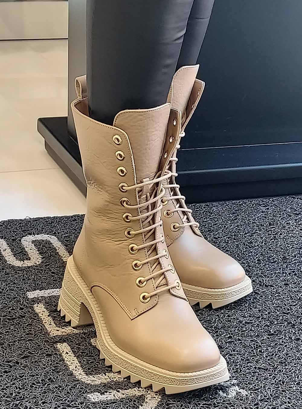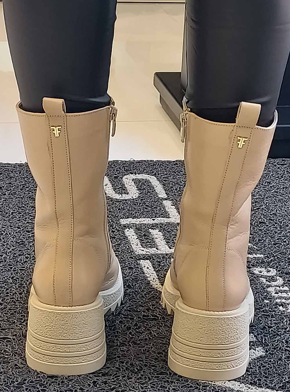 Γυναικεία δερμάτινα μπεζ μποτάκια με κορδόνι και μεταλλική λεπτομέρεια στο πίσω μέρος από το λογότυπο της ελληνικής εταιρείας FARDOULIS SHOES.