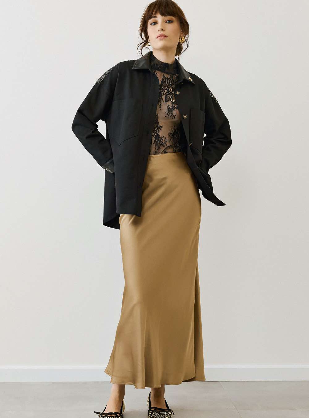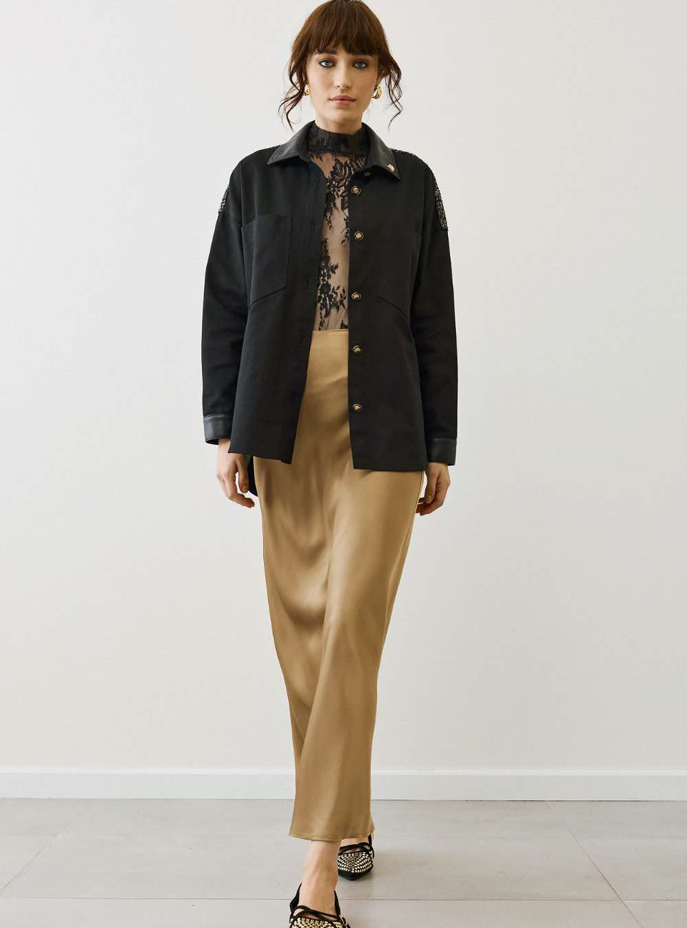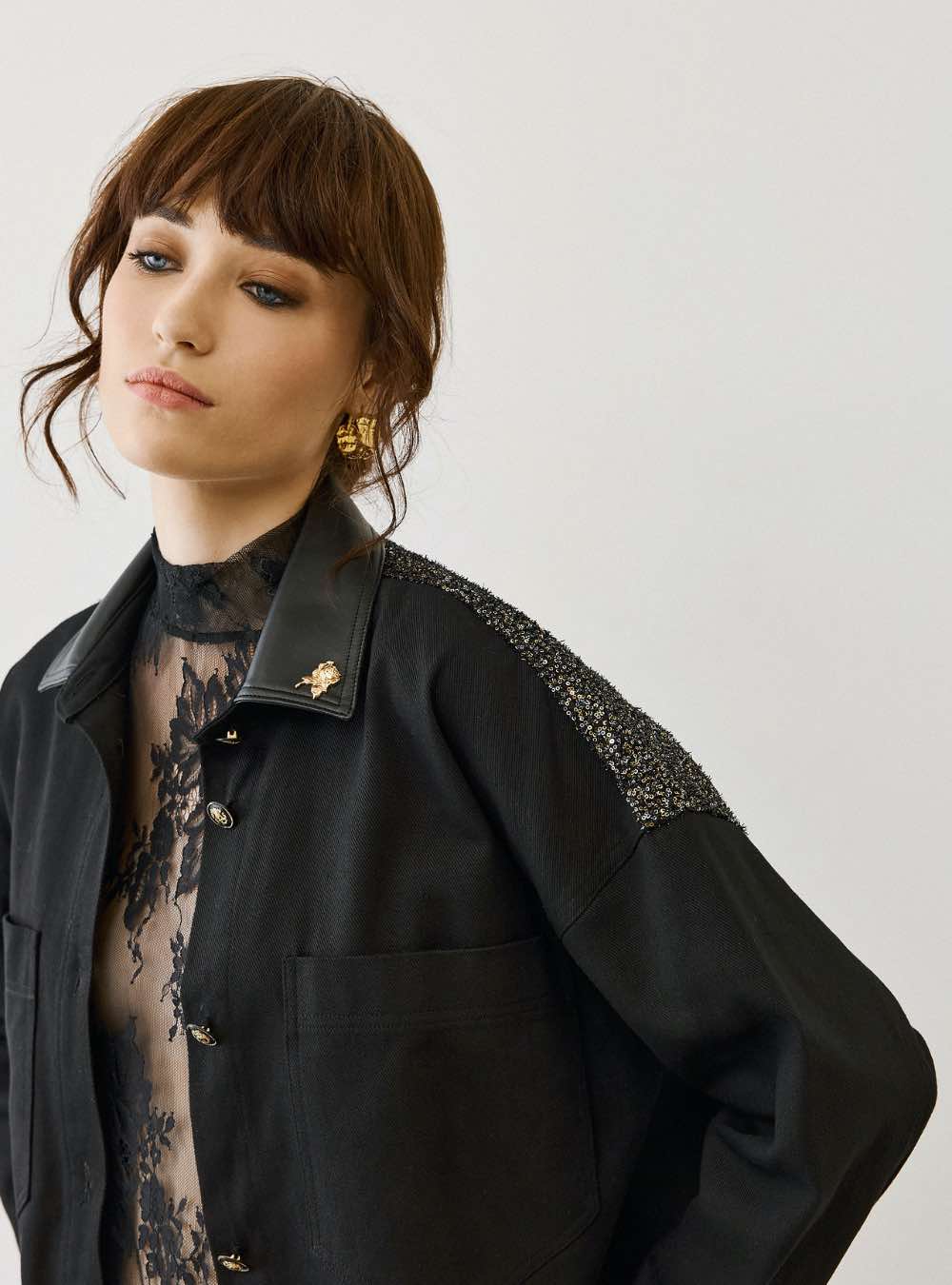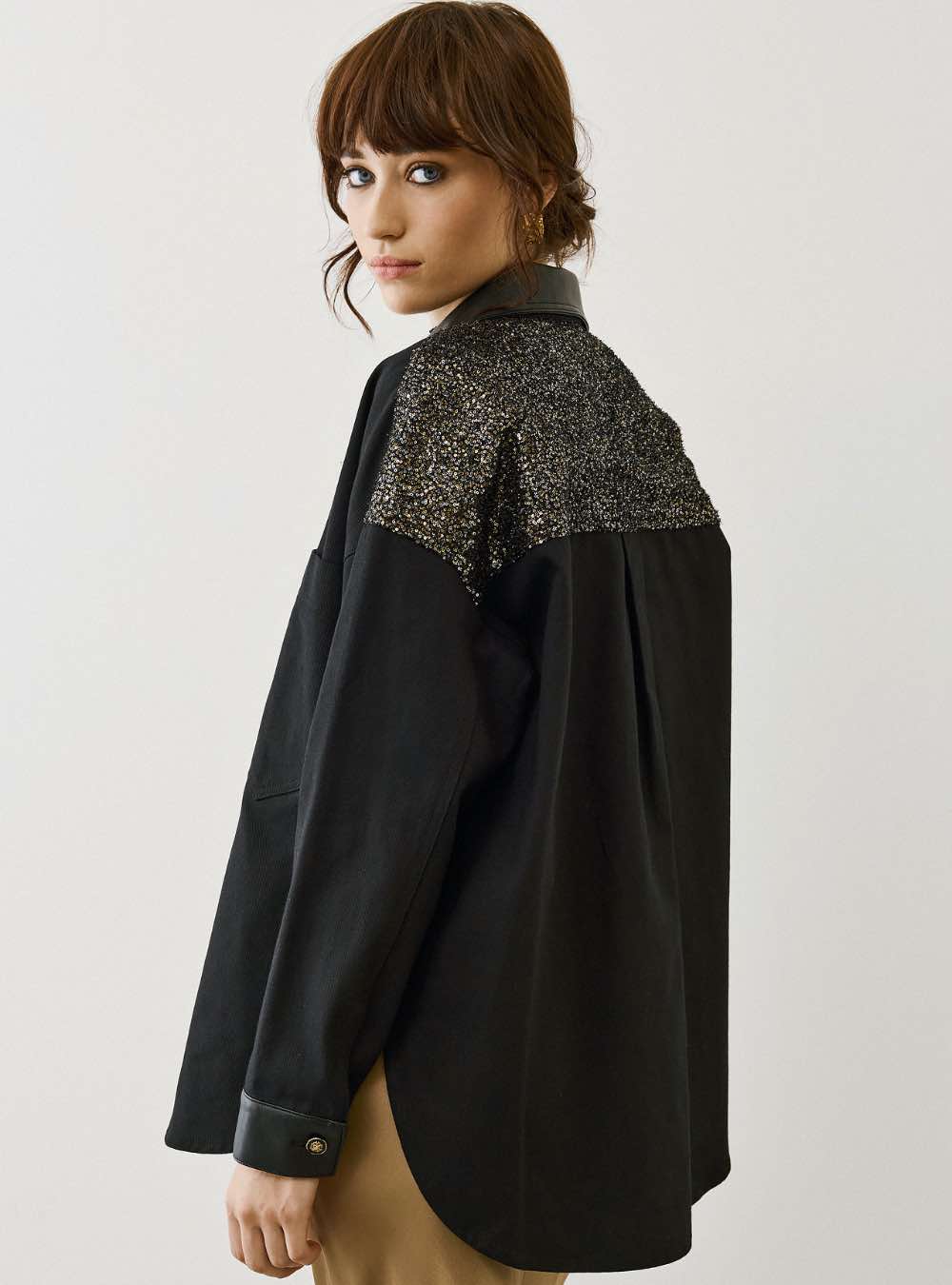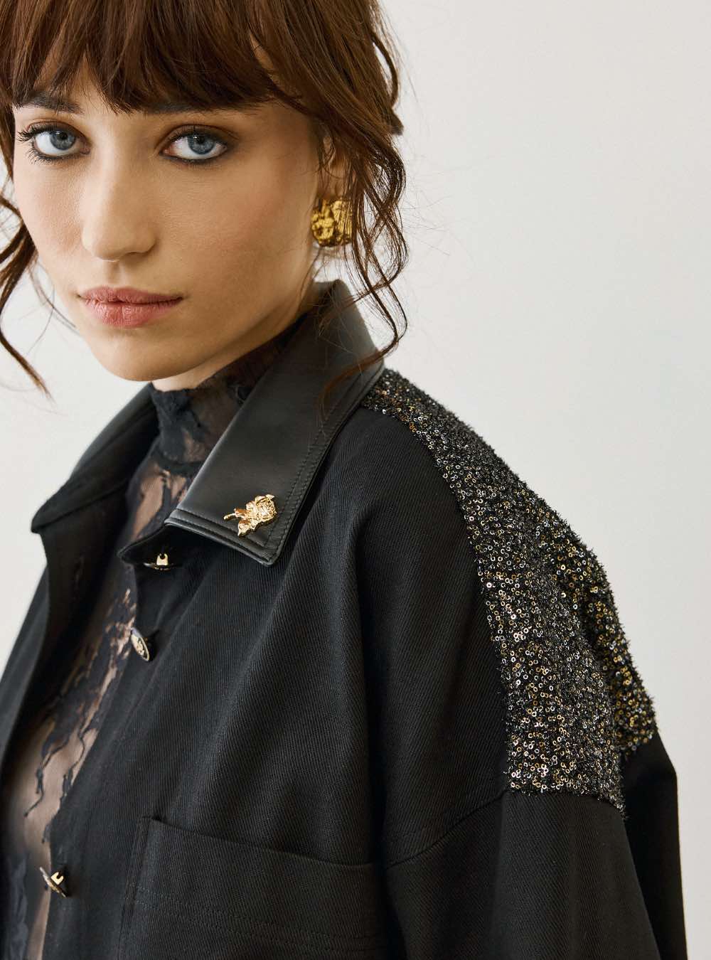 Γυναικείο μαύρο πουκάμισο με παγιέτες στους ώμους και στη πλάτη ,χρυσά κουμπιά και δερματίνη με χρυσό τριαντάφυλλο στον γιακά FIGARO FASHION.