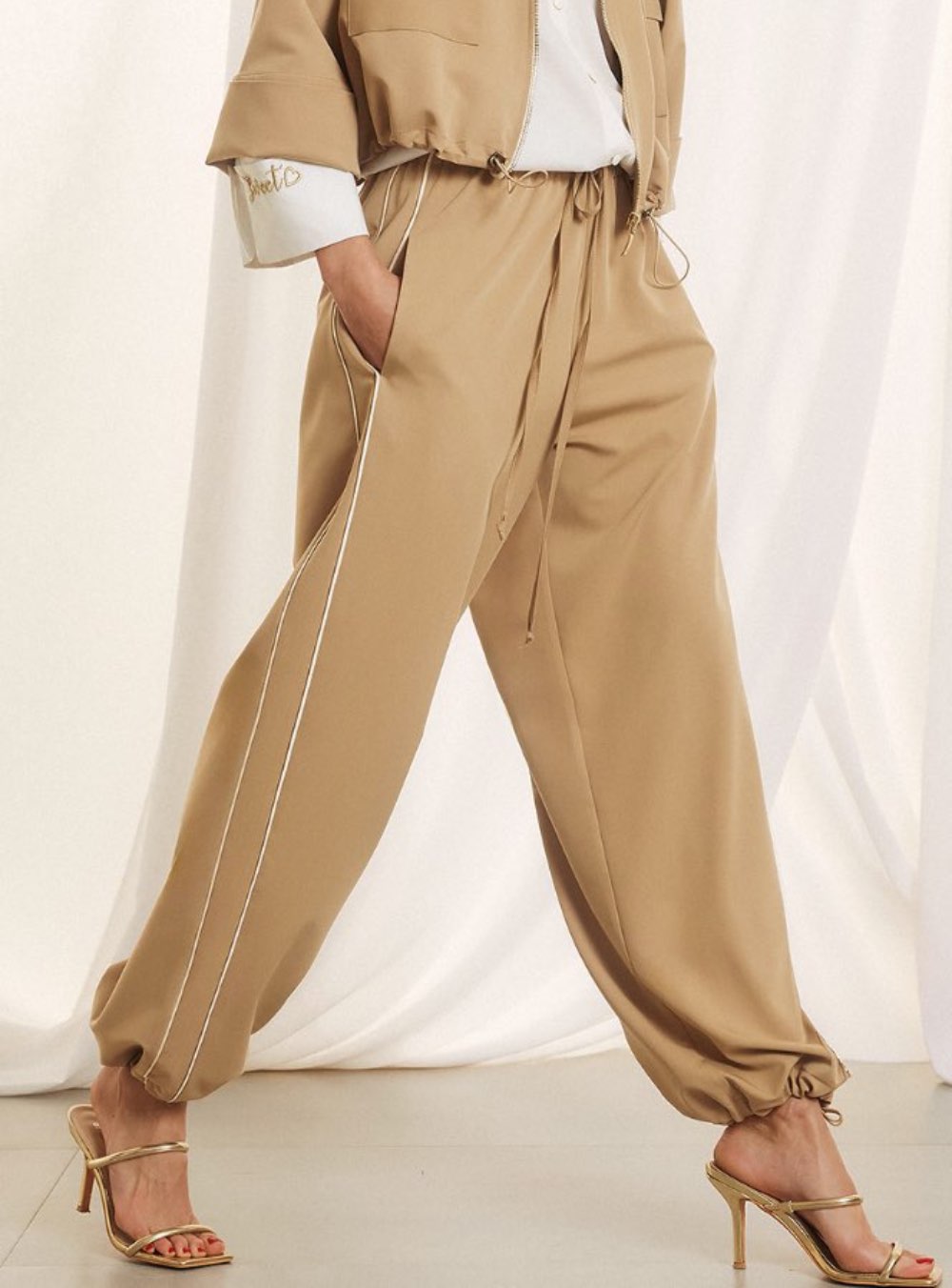 Γυναικείο παντελόνι με λάστιχο στη μέση και στο τελείωμα κατασκευασμένο από ανάλαφρο ύφασμα σε μπεζ χρώμα FIGARO FASHION.