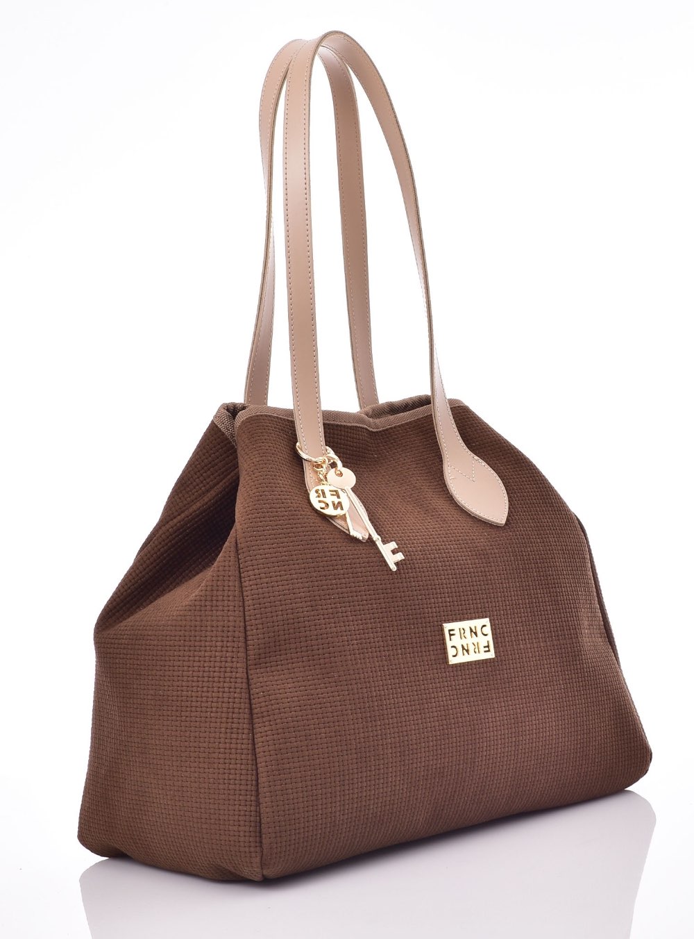 Γυναικεία τσάντα ώμου κατασκευασμένη από οικολογικό δέρμα εξωτερικά και ύφασμα εσωτερικά FRNC 5576. Διαθέτει: Κλείσιμο με μαγνήτη. Εσωτερική τσέπη. Φλουρί με χαραγμένο λογότυπο. Διακοσμητικό μπρελόκ ΔΙΑΣΤΑΣΕΙΣ: Μήκος: 35 cm Πλάτος: 17 cm Ύψος: 28 cm