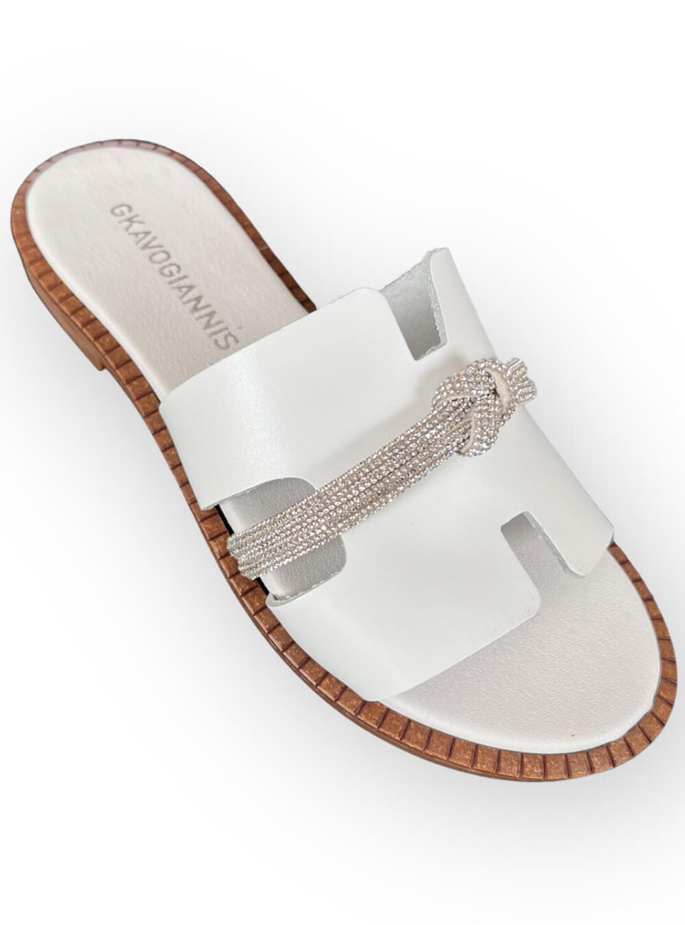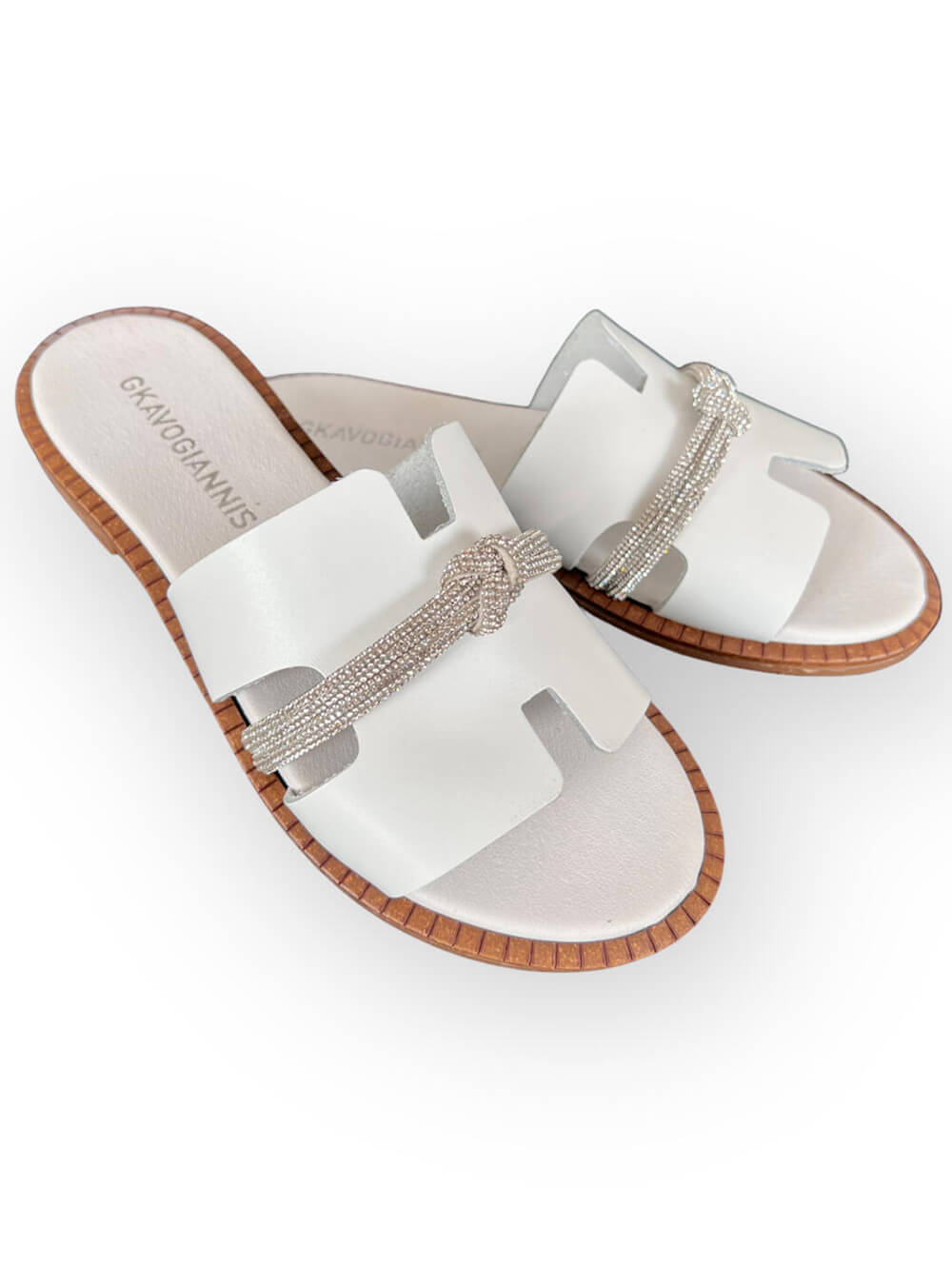 Σανδάλια δερμάτινα με φαρδιά φάσα με ανοίγματα. Έχουν λεπτή σειρά strass.