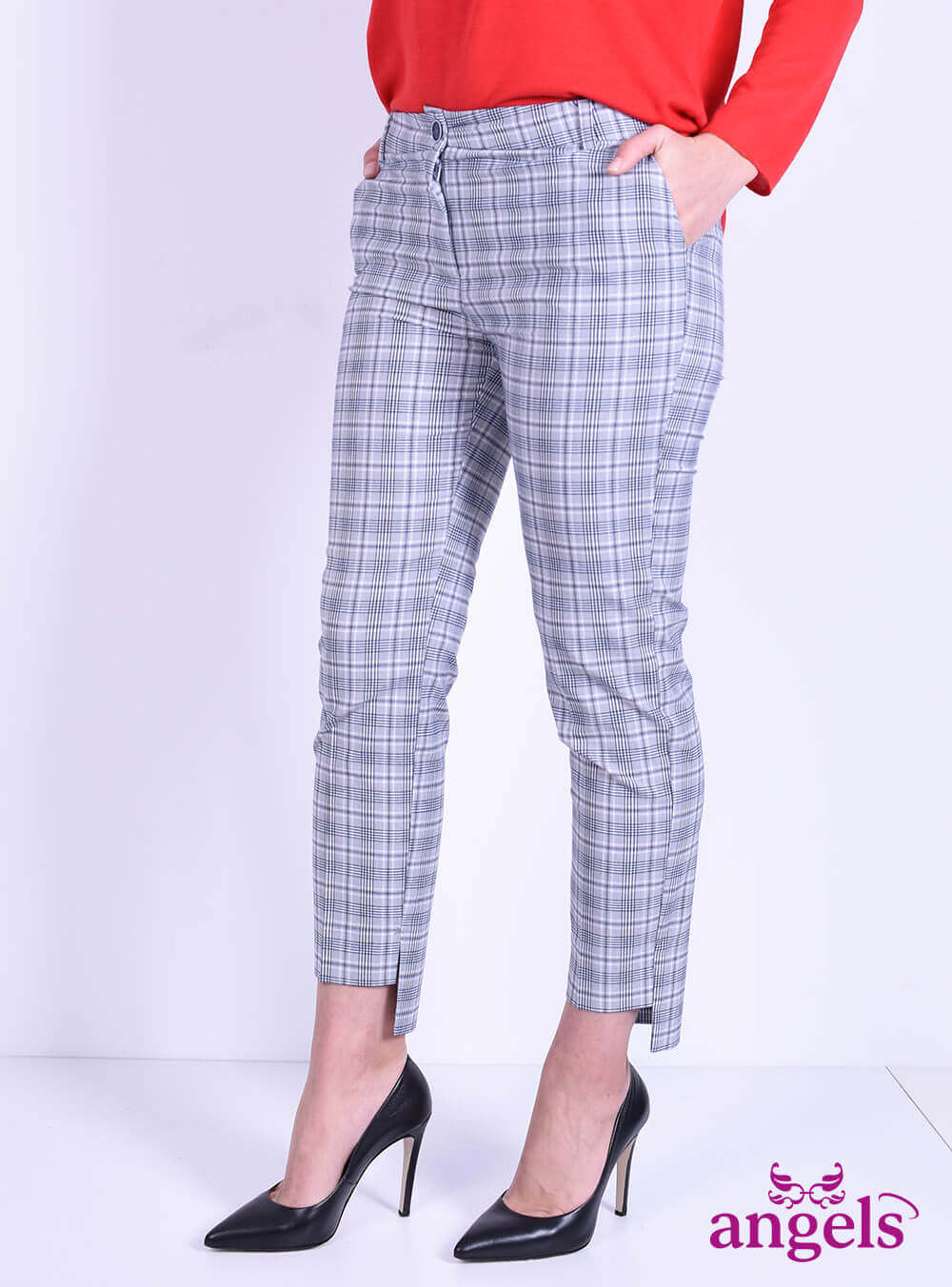 Εξαιρετικής ποιότητας γυναικείο υφασμάτινο παντελόνι καρό γκρι-μπλε-λευκό