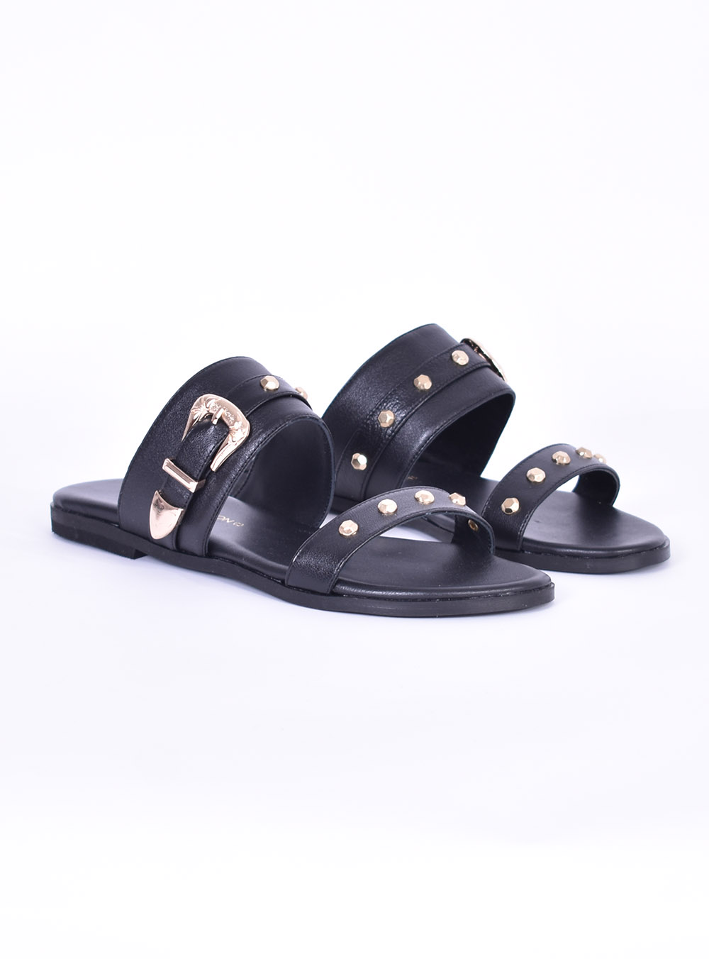 Γυναικεία δερμάτινα σανδάλια φλατ με με χρυσές λεπτομέρειες σε μαύρο χρώμα.