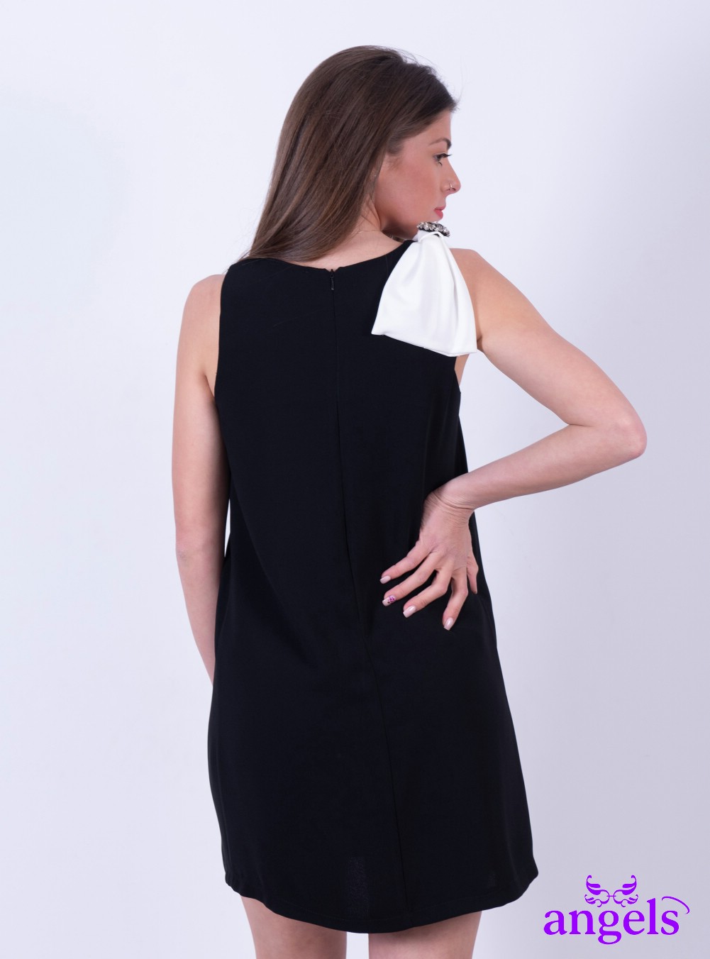 Γυναικείο μίνι μαύρο φόρεμα με λευκό φιόγκο στον έναν ώμο,αμάνικο.