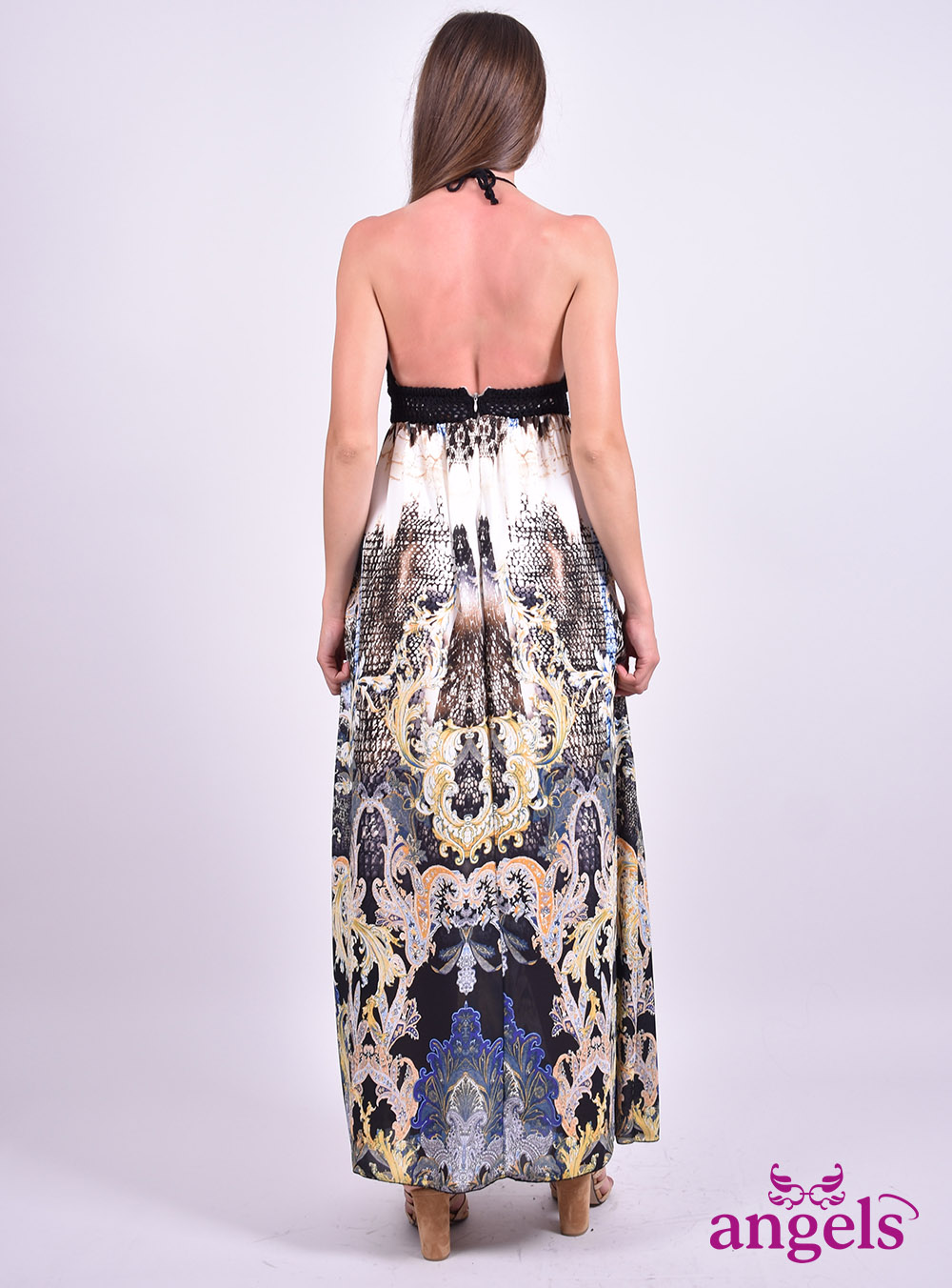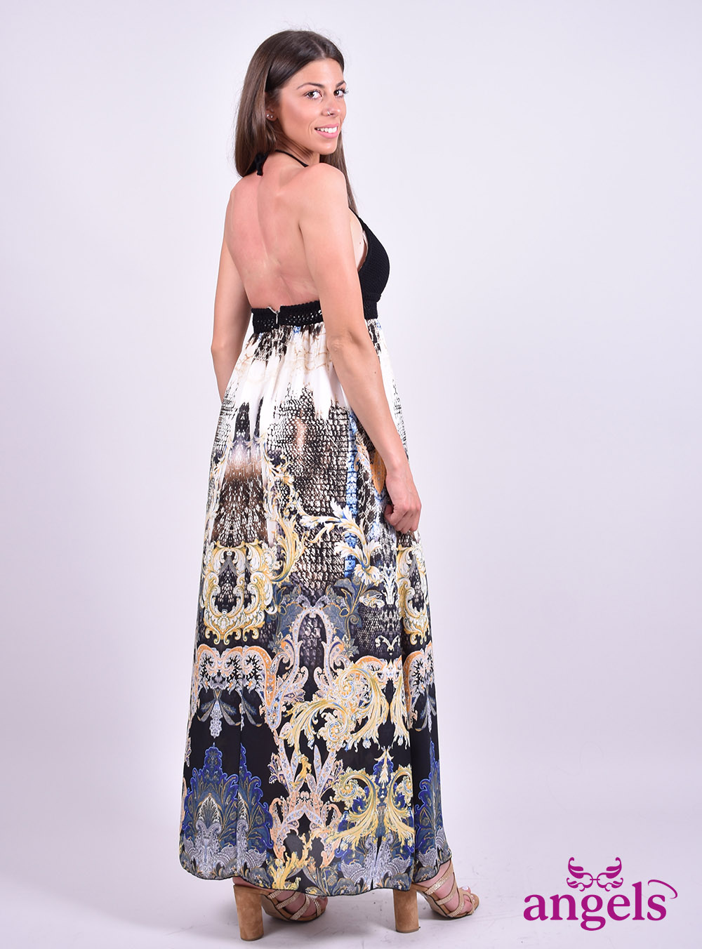 Γυναικείο maxi φόρεμα με συνδυασμό πλεκτό στο στήθος και εμπριμέ