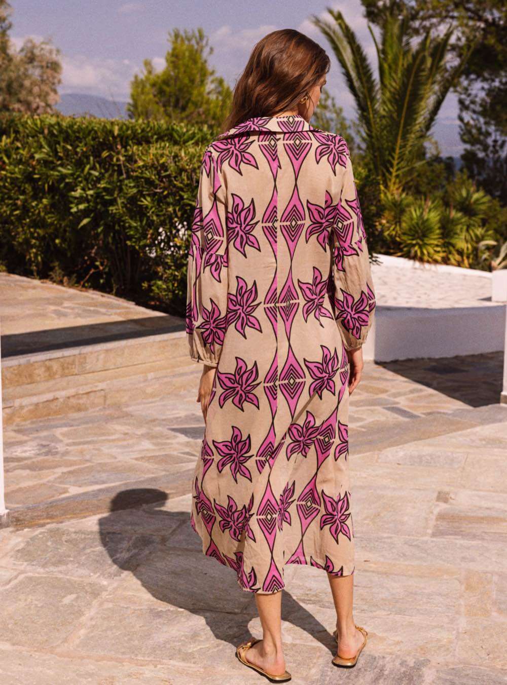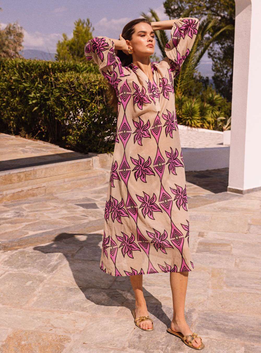 Μίντι βαμβακερό φόρεμα με υπέροχο print ,τρουακάρ μανίκια και v λαιμόκοψη NEMA DESMA II DRESS
