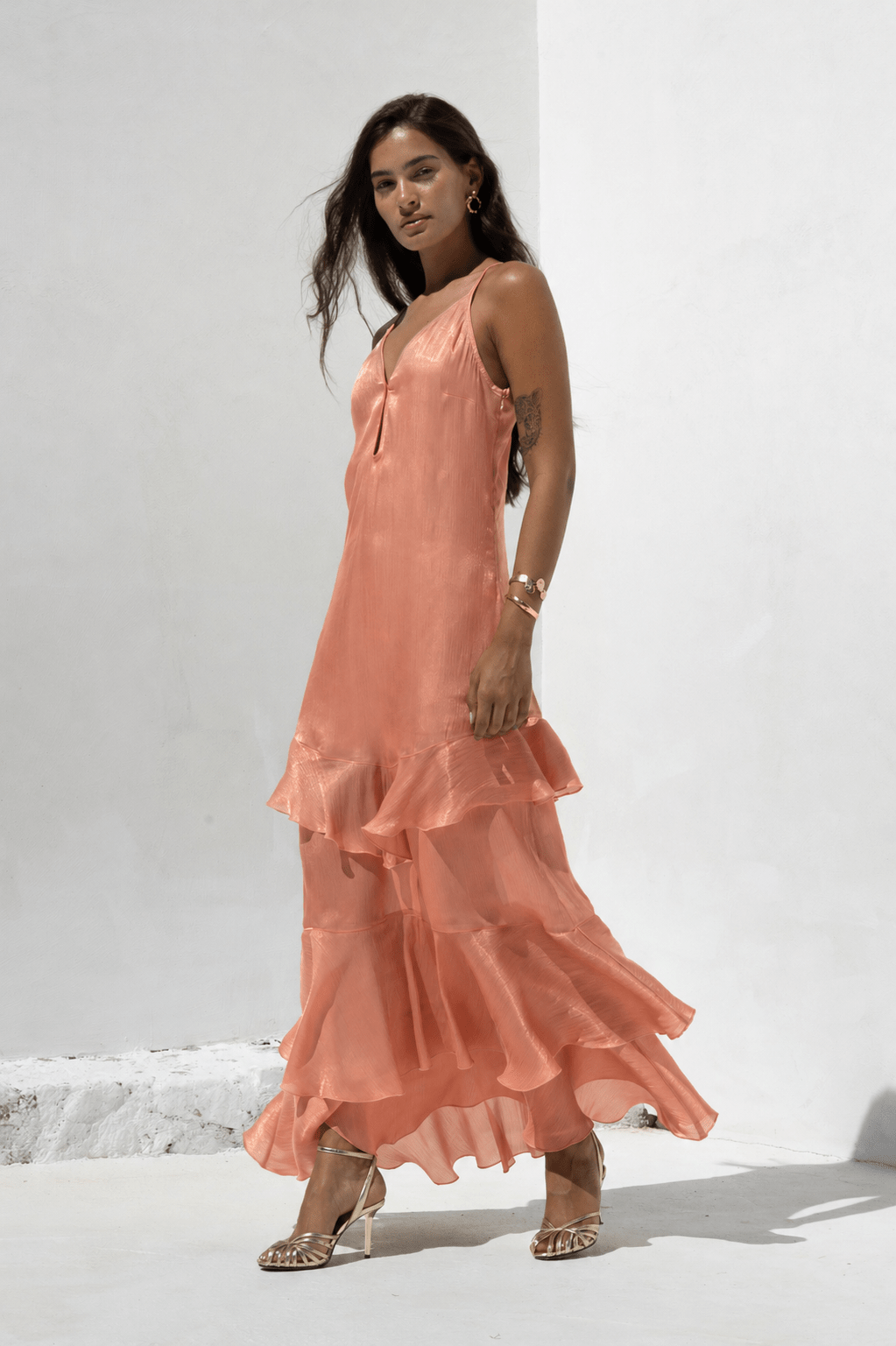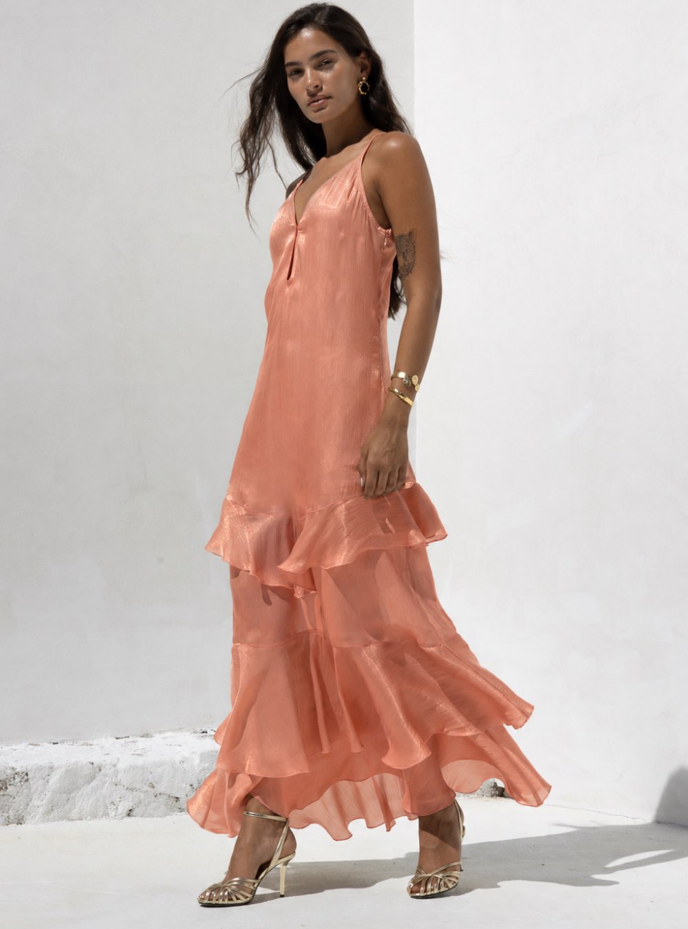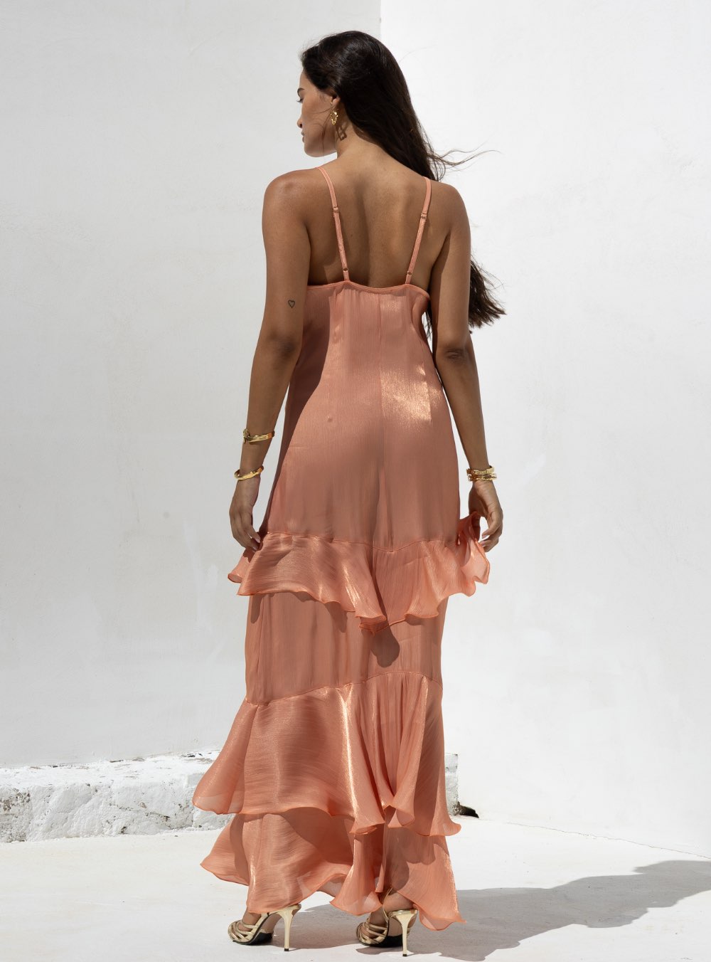 Μακρύ τιραντέ φόρεμα με V ντεκολτέ και βολαν στο τελείωμα σε τέλειο καλοκαιρινό ροδακινί χρώμα peach NEMA RESORT WEAR.