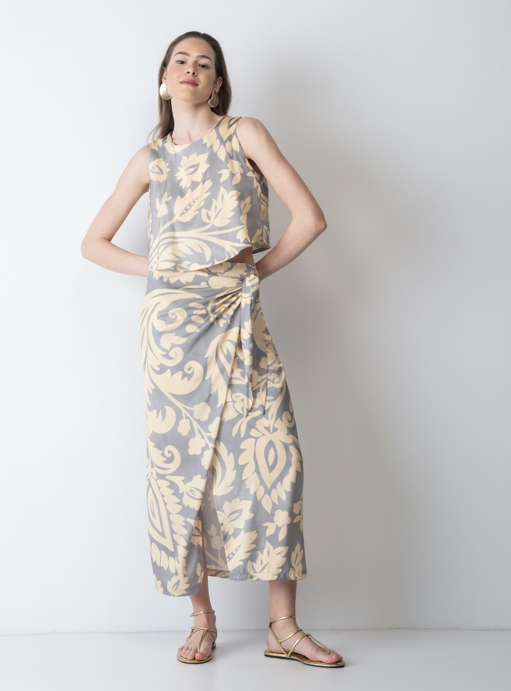 Γυναικεία αμάνικη κοντή μπλούζα με σατινέ απαλή υφή (silky touch) NEW AGE ALMYRA TOP Κατασκευασμένη από ανάλαφρο ύφασμα σατινέ. Υπέροχο συνδυασμό χρωμάτων και print. Σύνθεση:65%REC_POL-33%POL-2%SP