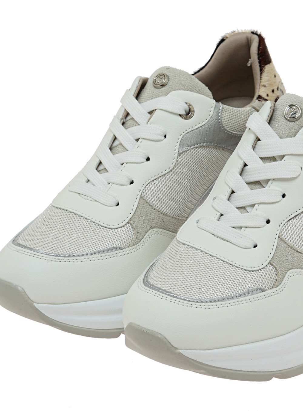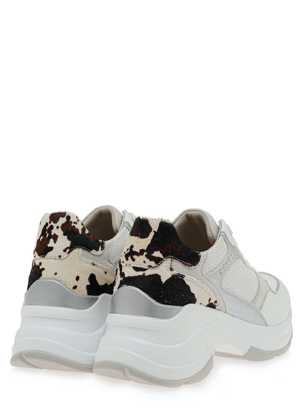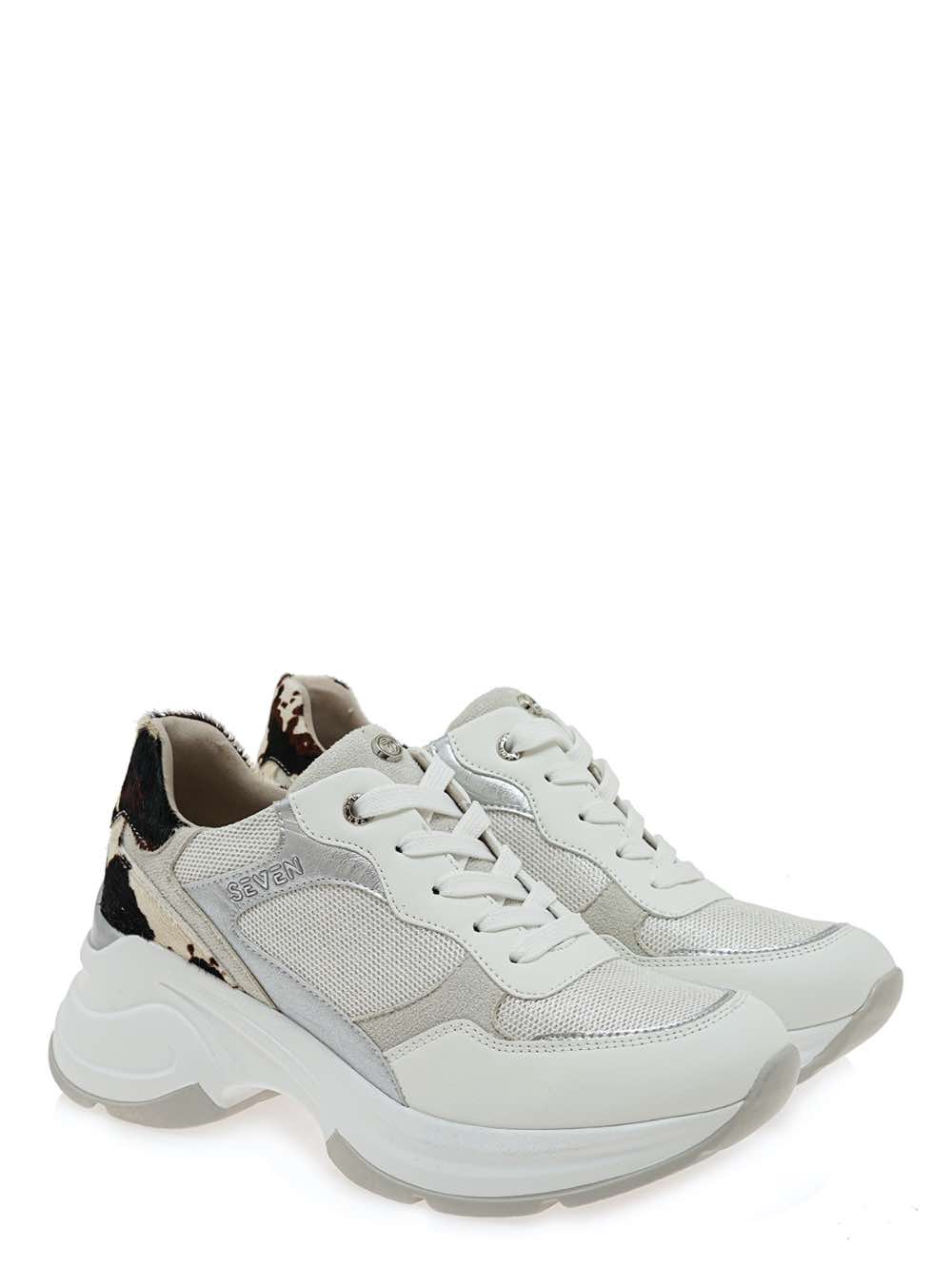 Γυναικεία sneakers με άνετη χοντρή σόλα σε λευκό χρώμα με ασημί και λεπτομέρεια δέρματος COW PONY.