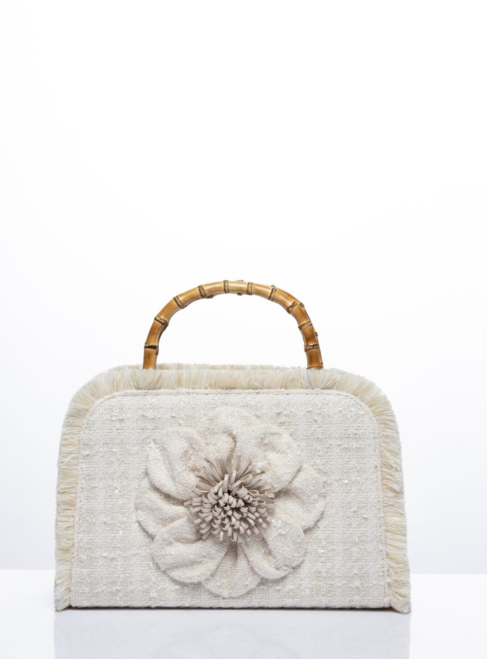 SORENA Τσάντα χειρός PALOMA WHITE Το ανάγλυφο ύφασμα, πλαισιωμένο με παιχνιδιάρικες φούντες και διακοσμημένο με μια λεπτεπίλεπτη oversized λουλουδάτη εφαρμογή, μετατρέπει αυτή την τσάντα σε πραγματικό fashion treasure.