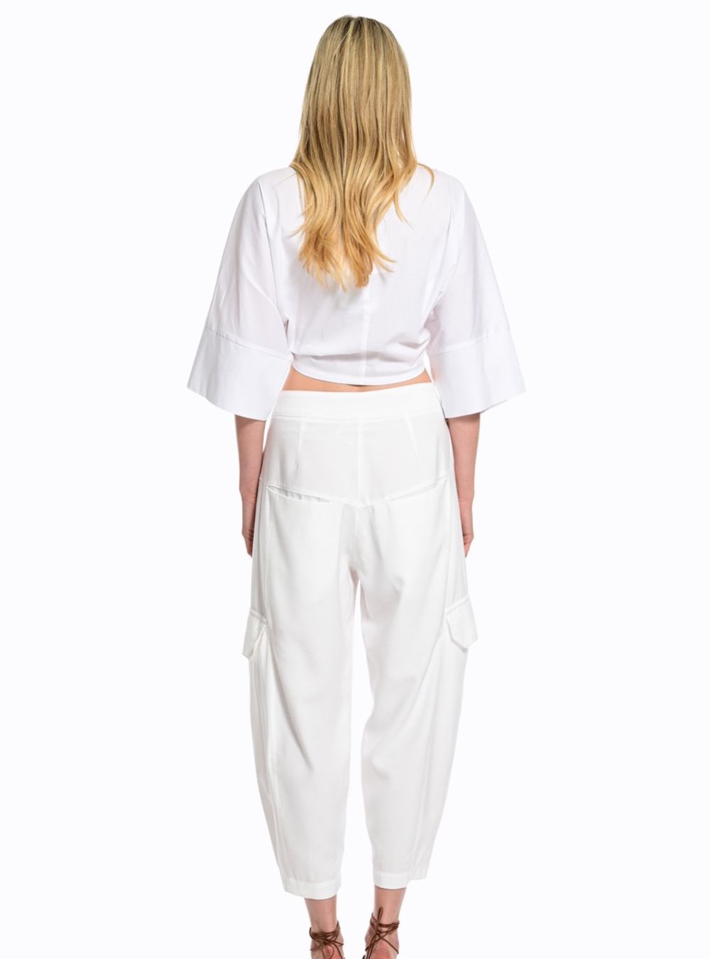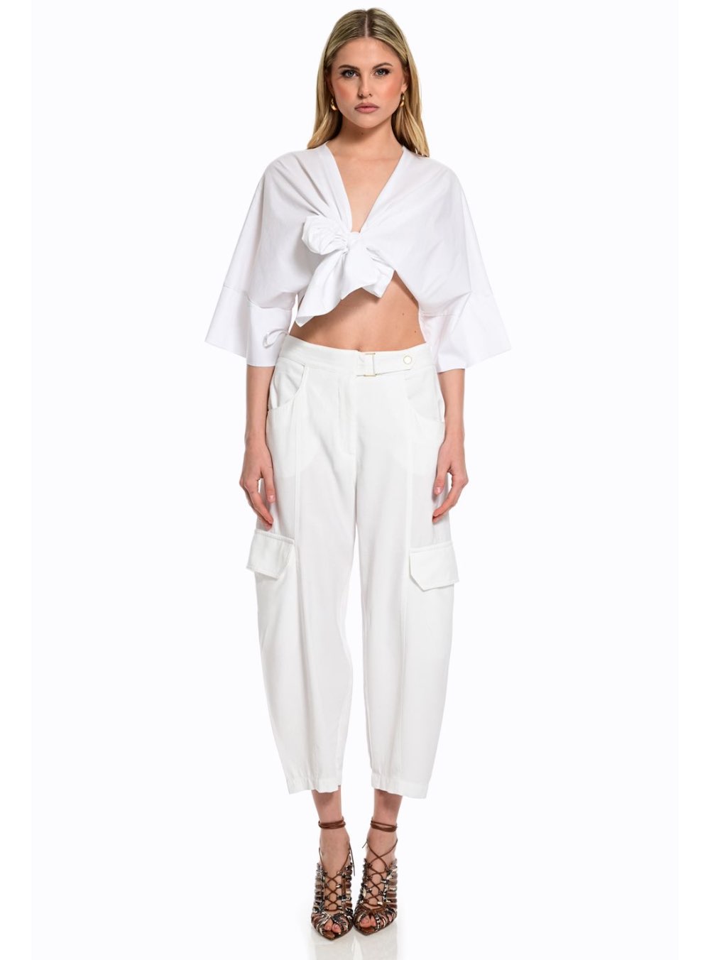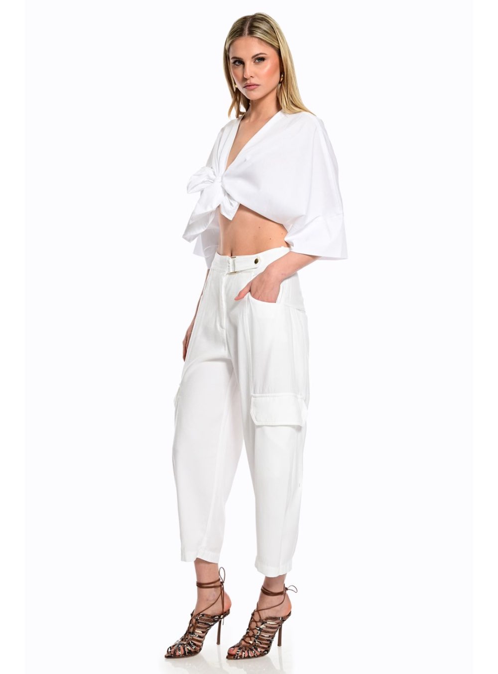 Γυναικεία μπλούζα με δέσιμο μπροστά και τρουακάρ ανοιχτά μανίκια σε λευκό χρώμα WE COSS.