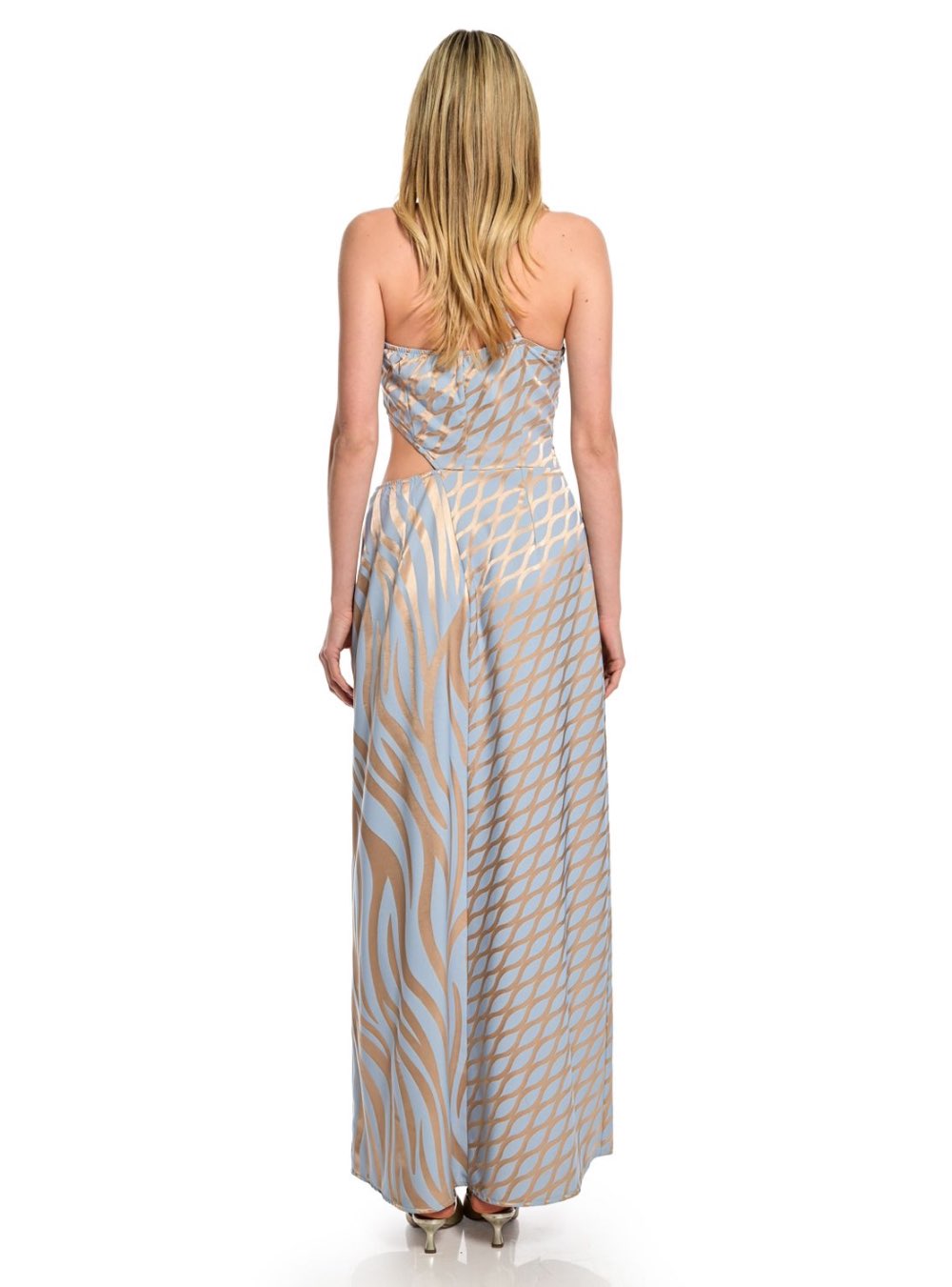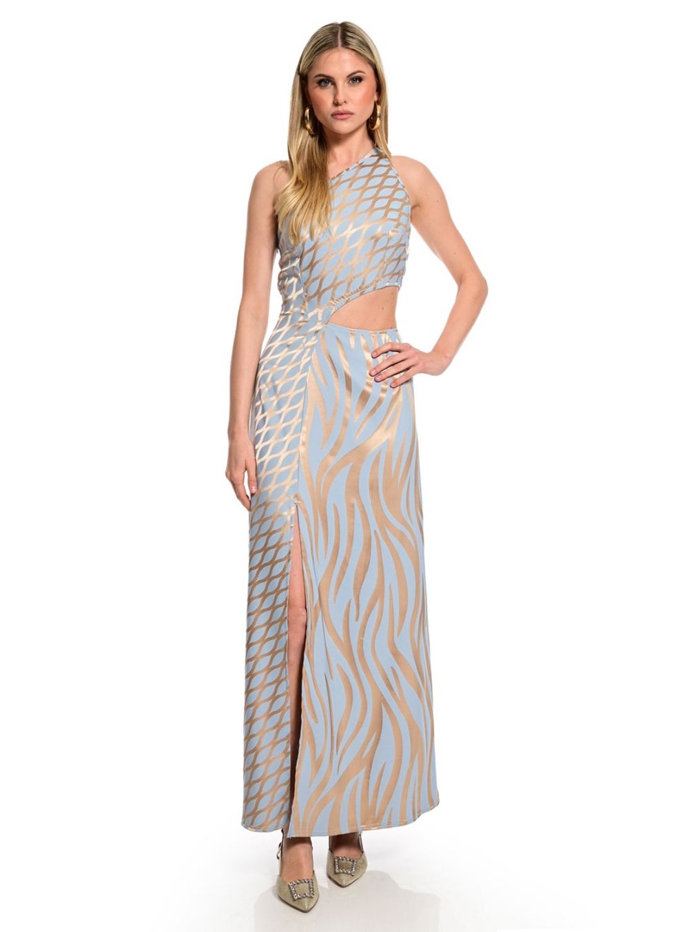 Μακρύ φόρεμα με έναν ώμο και ωραίο συνδυασμό χρωμάτων γαλάζιο με χρυσό και αφηρημένα σχέδια WE COSS.