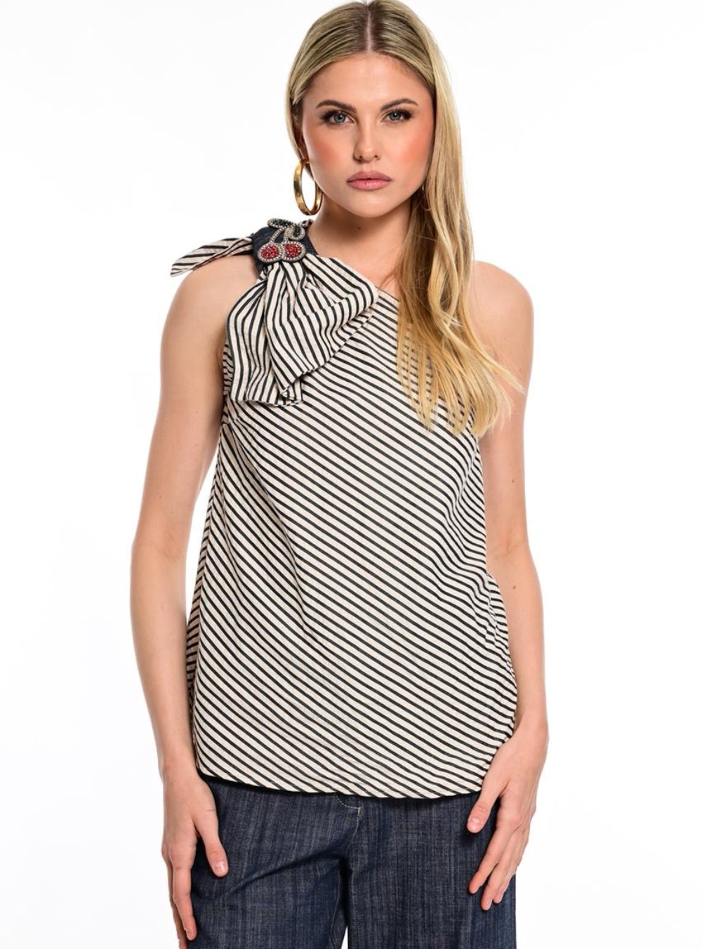Γυναικεία μπλούζα ριγέ με έναν ώμο και διακοσμητικό κερασάκι με στρας στον φιόγκο WE COSS. Σύνθεση:45%COT-51%POL-4%RAY